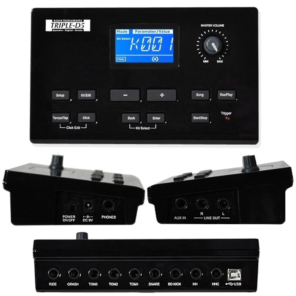 The Triple-D5 sound module contains no less than 327 individual drum sounds that can be assembled in to kits in any number of combinations. A total of 30 kit locations are available each expertly programmed by default to give you a variety of choice.