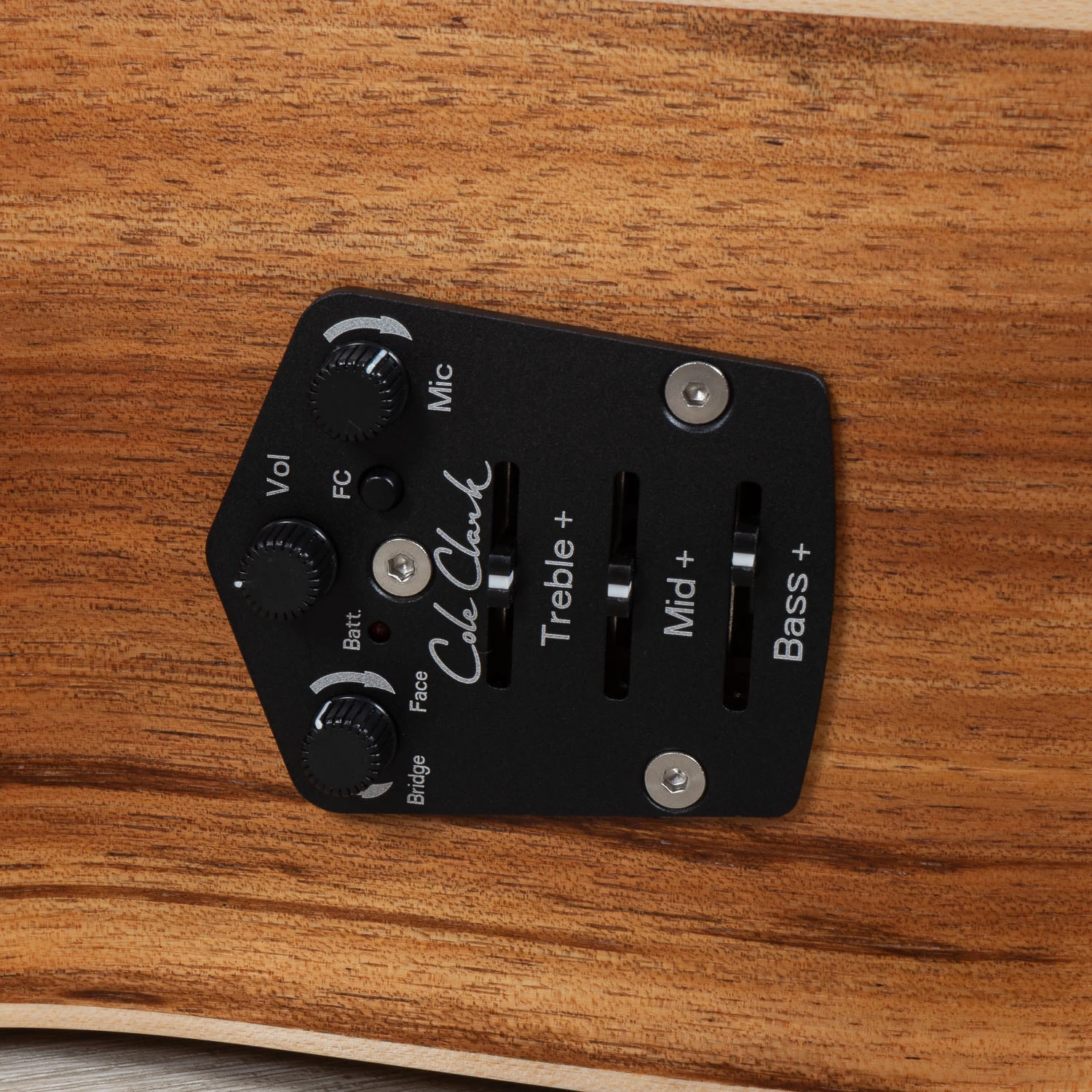 As a result, Cole Clark designed a guitar with a properly-placed Lollar Imperial humbucker bridge pickup for faithful electric guitar tone and a more stable dual-output guitar design that serves as almost an antithesis to piezo-equipped solidbody electric guitars.