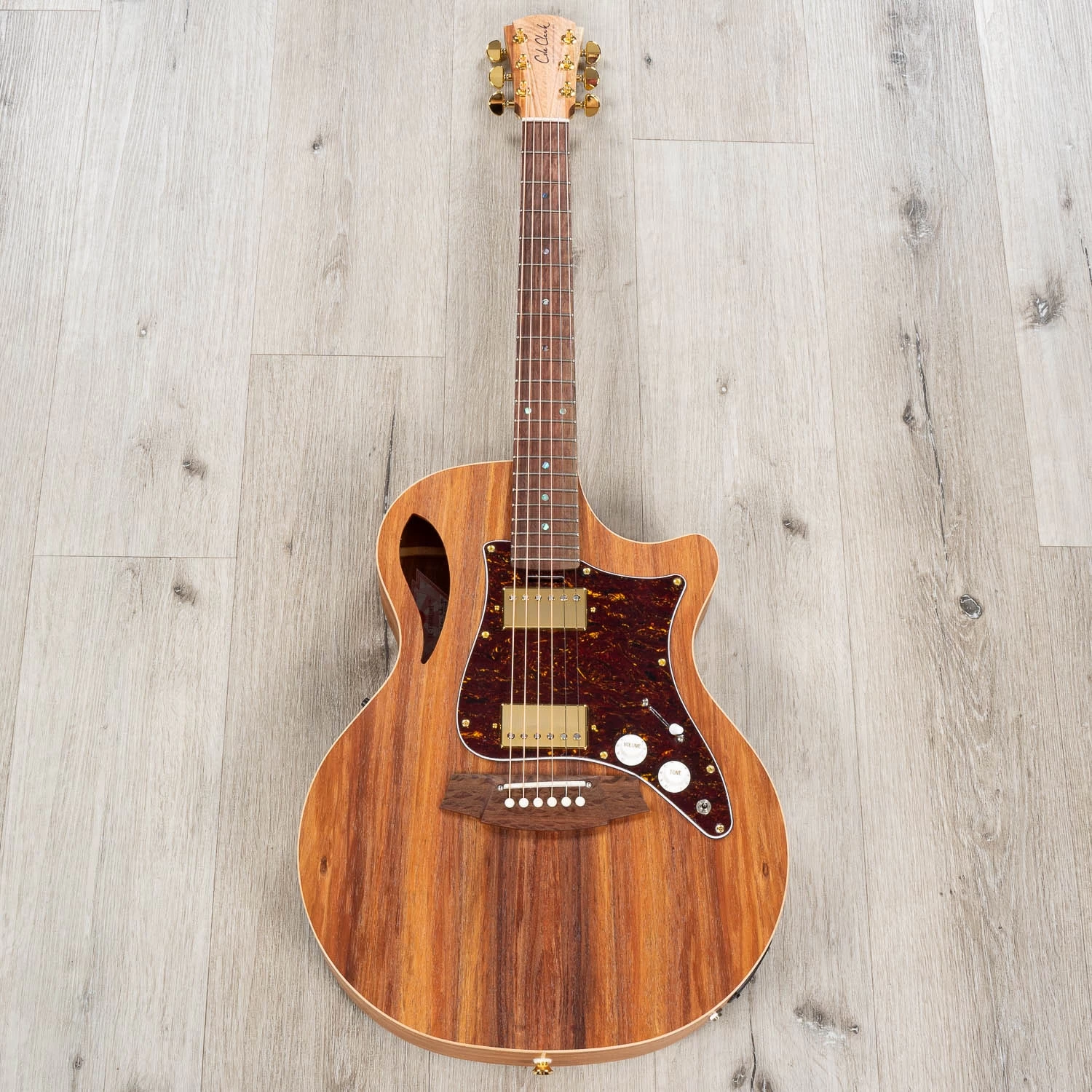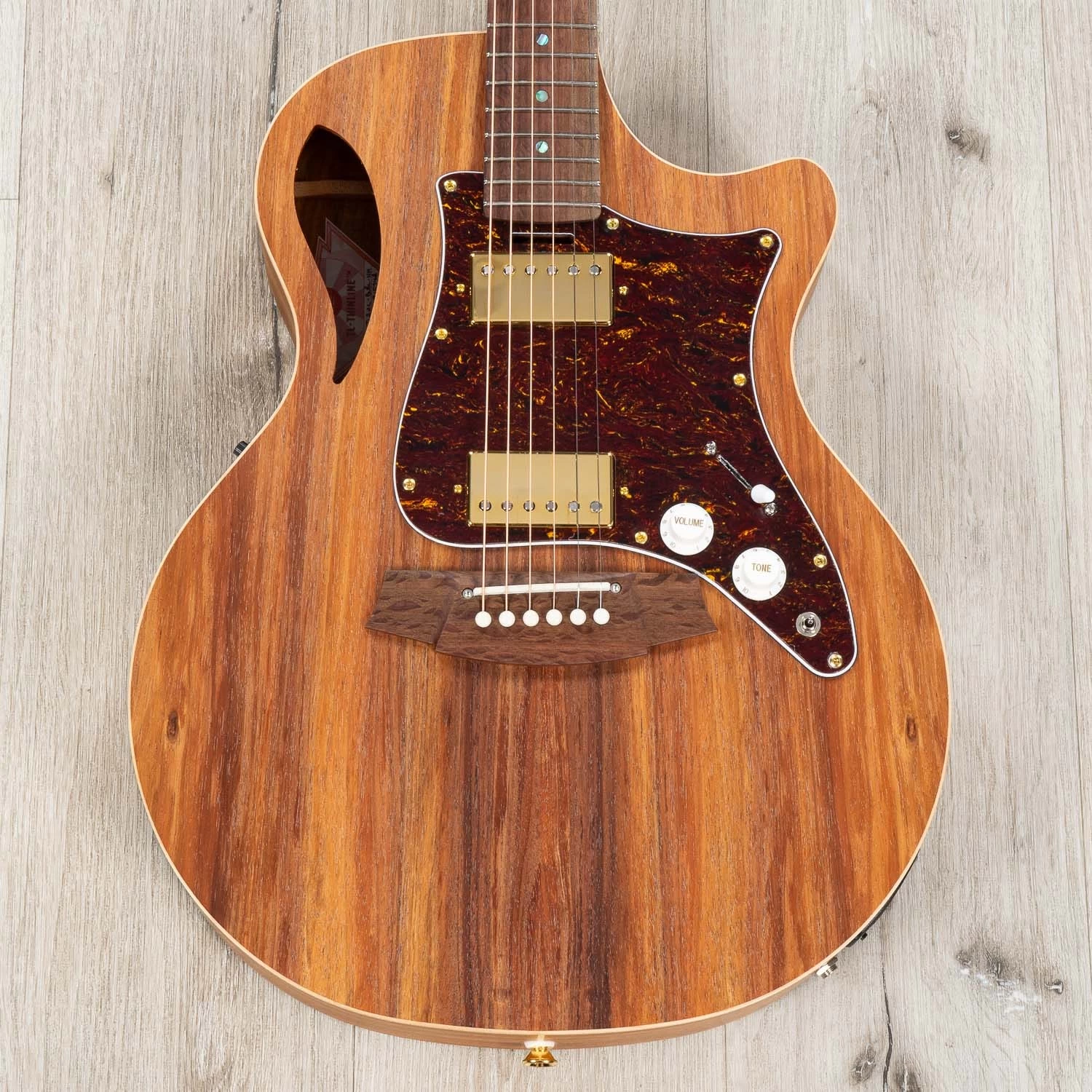 - All solid timber cutaway True Hybrid Thinline Grand Auditorium with F.E.A internal bracing