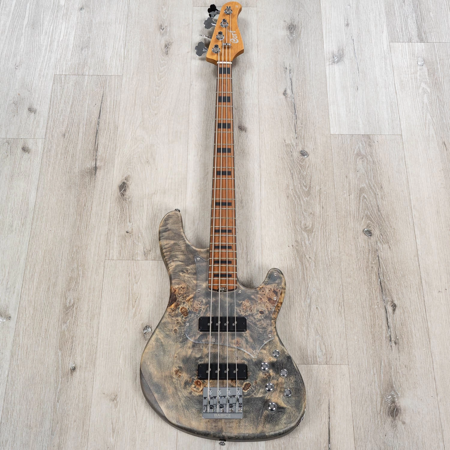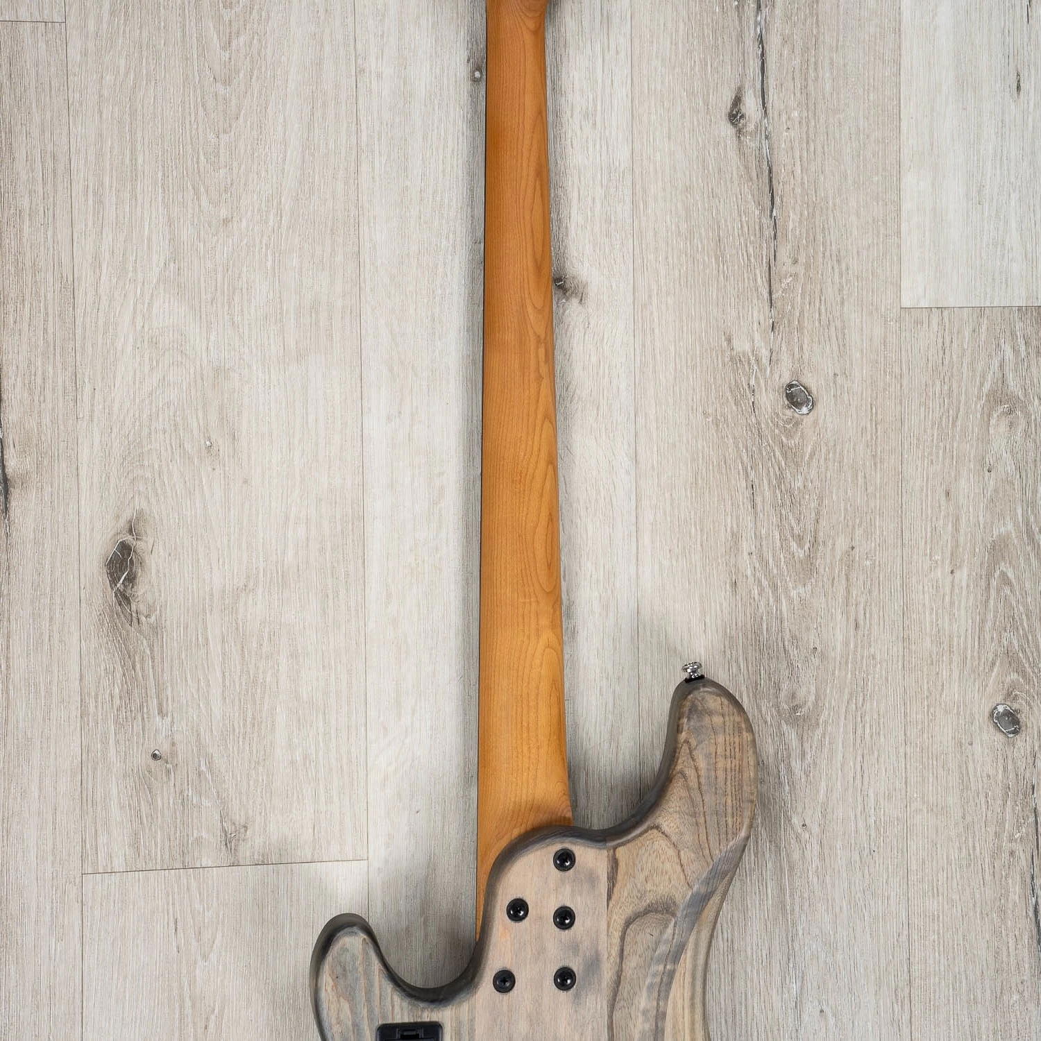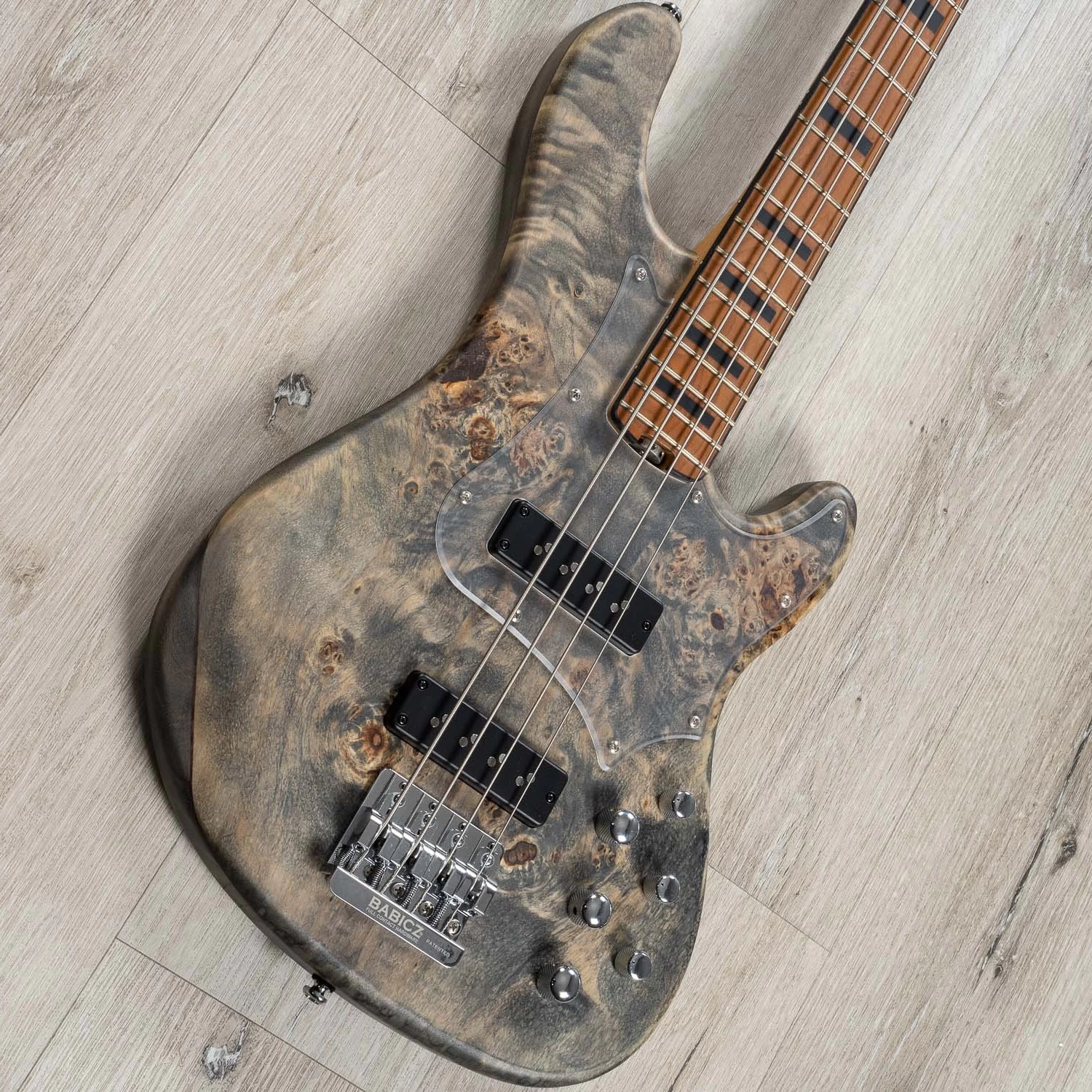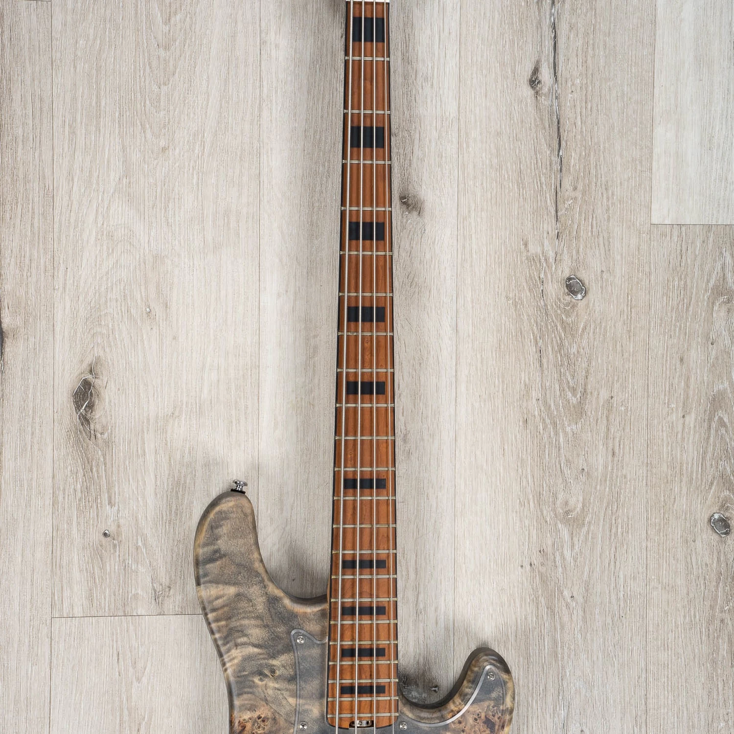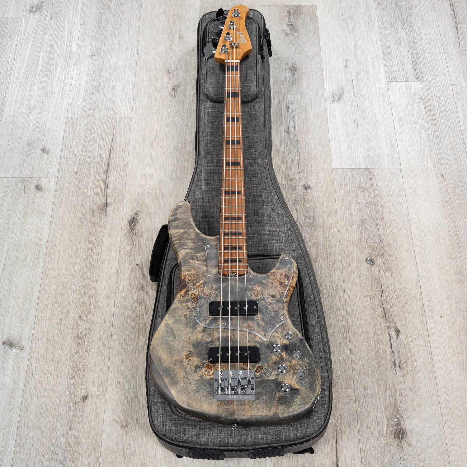 Oftentimes the weight of the instrument affects the playing experience, and on a larger instrument like a bass guitar more fatigue is caused by heavier weight. While many manufacturers seek solutions by carving out large sections of body wood to reduce weight, the GB Modern’s body is cleverly designed to be just as light without physically tempering the body. The maple body core is paired with light-weight paulownia wings, then gets covered with gorgeous poplar burl on the top side and white ash on the back, resulting in a combination of great tonewoods that is excellent both sonically and aesthetically.