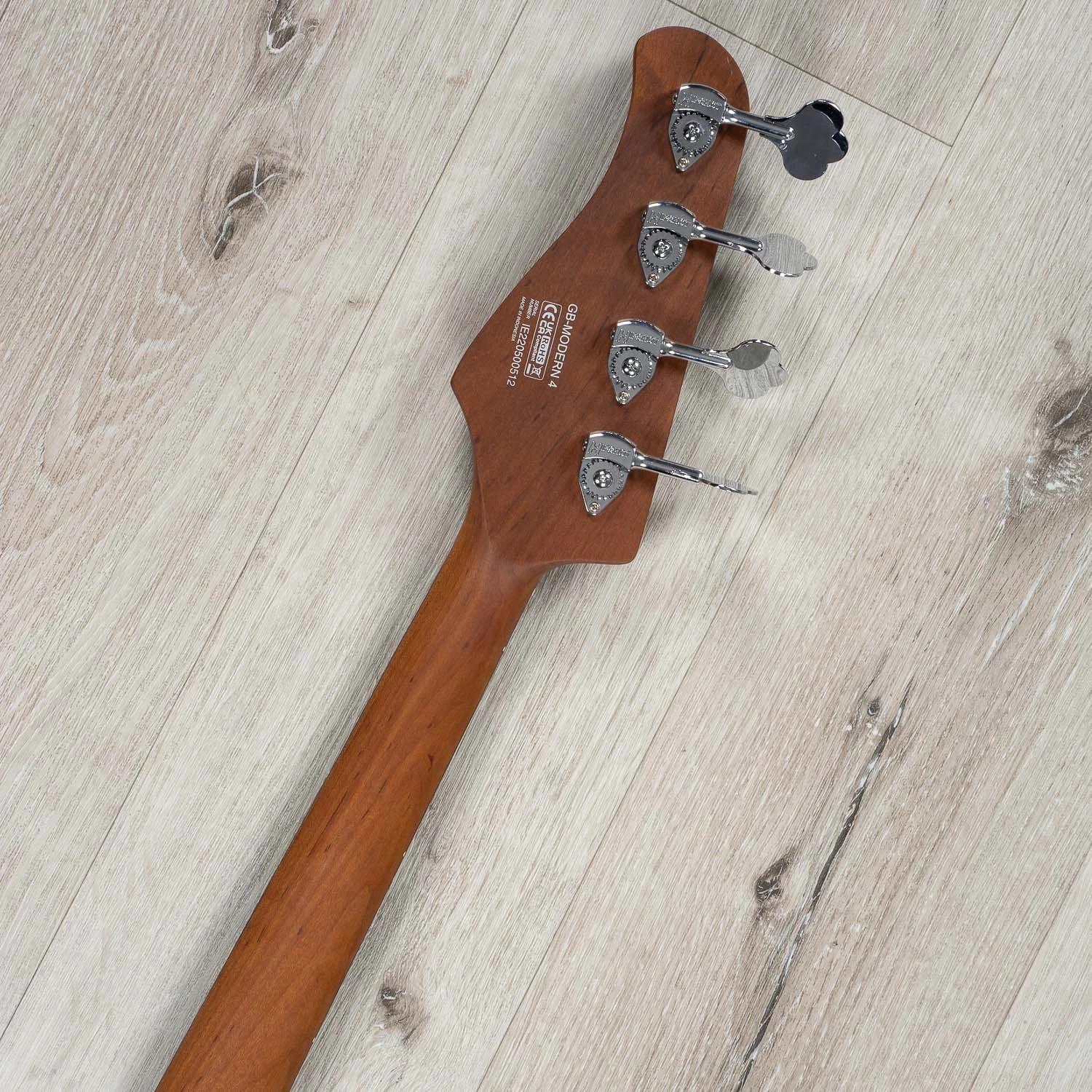 Oftentimes the weight of the instrument affects the playing experience, and on a larger instrument like a bass guitar more fatigue is caused by heavier weight. While many manufacturers seek solutions by carving out large sections of body wood to reduce weight, the GB Modern’s body is cleverly designed to be just as light without physically tempering the body. The maple body core is paired with light-weight paulownia wings, then gets covered with gorgeous poplar burl on the top side and white ash on the back, resulting in a combination of great tonewoods that is excellent both sonically and aesthetically.