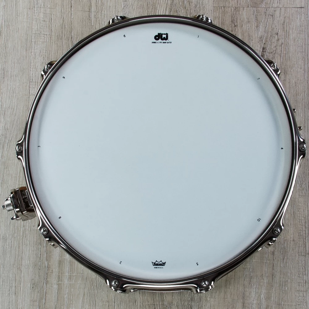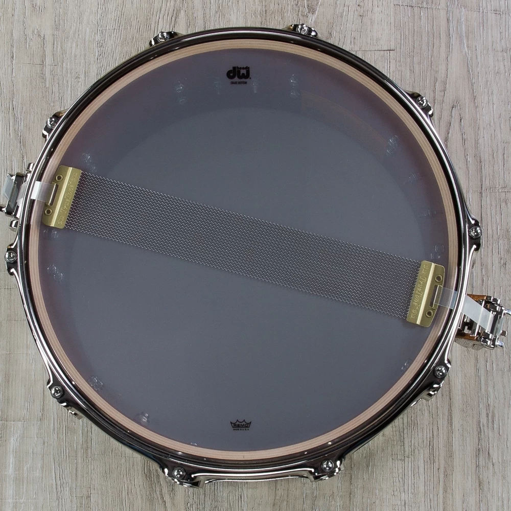 This specialty snare drum is designed to offer warmth, volume and throaty attack in one package. The hybrid shell is an offshoot of the patented Edge design (U.S. Patent #5377576) and features a heavy-gauge cast brass ring press-fit on top of a 10-ply Maple and Mahogany plied shell with VLT (Vertical Low Timber) technology. The result is a snare drum with plenty of bite, combined with ample bottom end response. Other standard features include 3.0 True Hoops, True Pitch Tuning, MAG Throw-Off System with 3P butt plate and DW Heads by Remo USA.