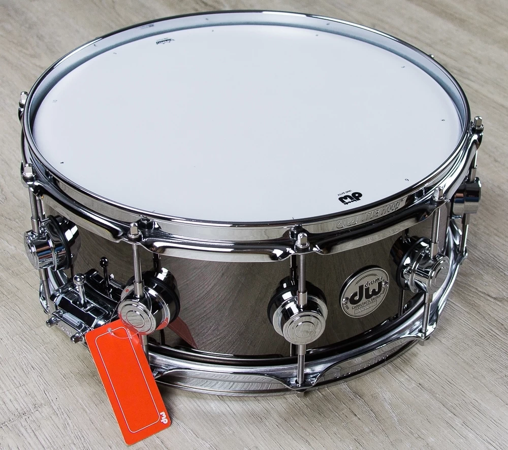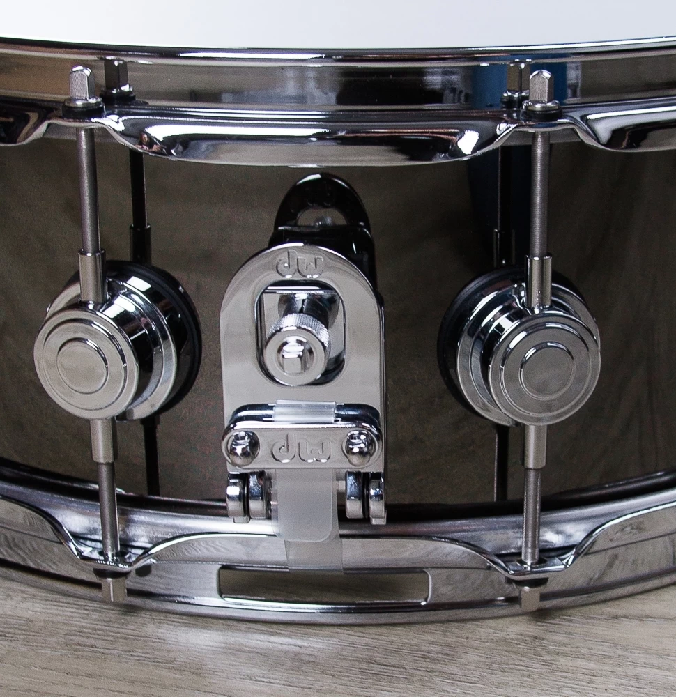 Utilizing a thin industry-standard 1mm shell, and plated with sleek black nickel, the Collector’s Series Black Nickel over Brass is a versatile workhorse snare. Suitable for a variety of musical applications, it offers that sought-after “classic studio brass snare sound” for Rock, Jazz, and beyond; offering brightness and cut with a decidedly metallic tonal characteristic. Customize it with any available DW Custom Shop drum hardware color.