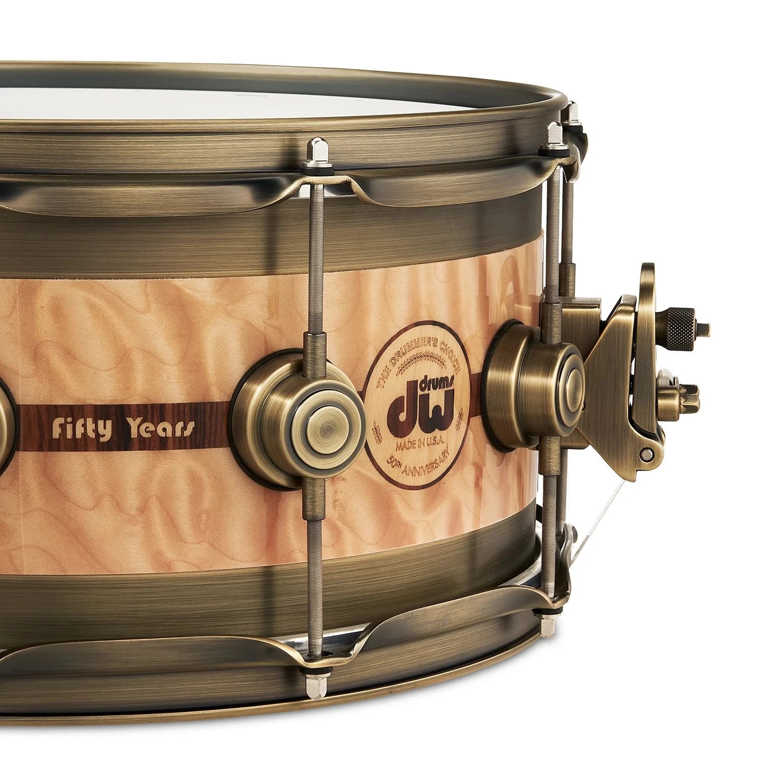 The Limited-Edition 50th Anniversary DW Edge® Snare sandwiches 11-ply persimmon and spruce shell with a quilted maple veneer and commemorative inlaid badge between two heavy-duty brass rings to boost versatility with a sharper attack while maintaining the drum’s unique tonality.