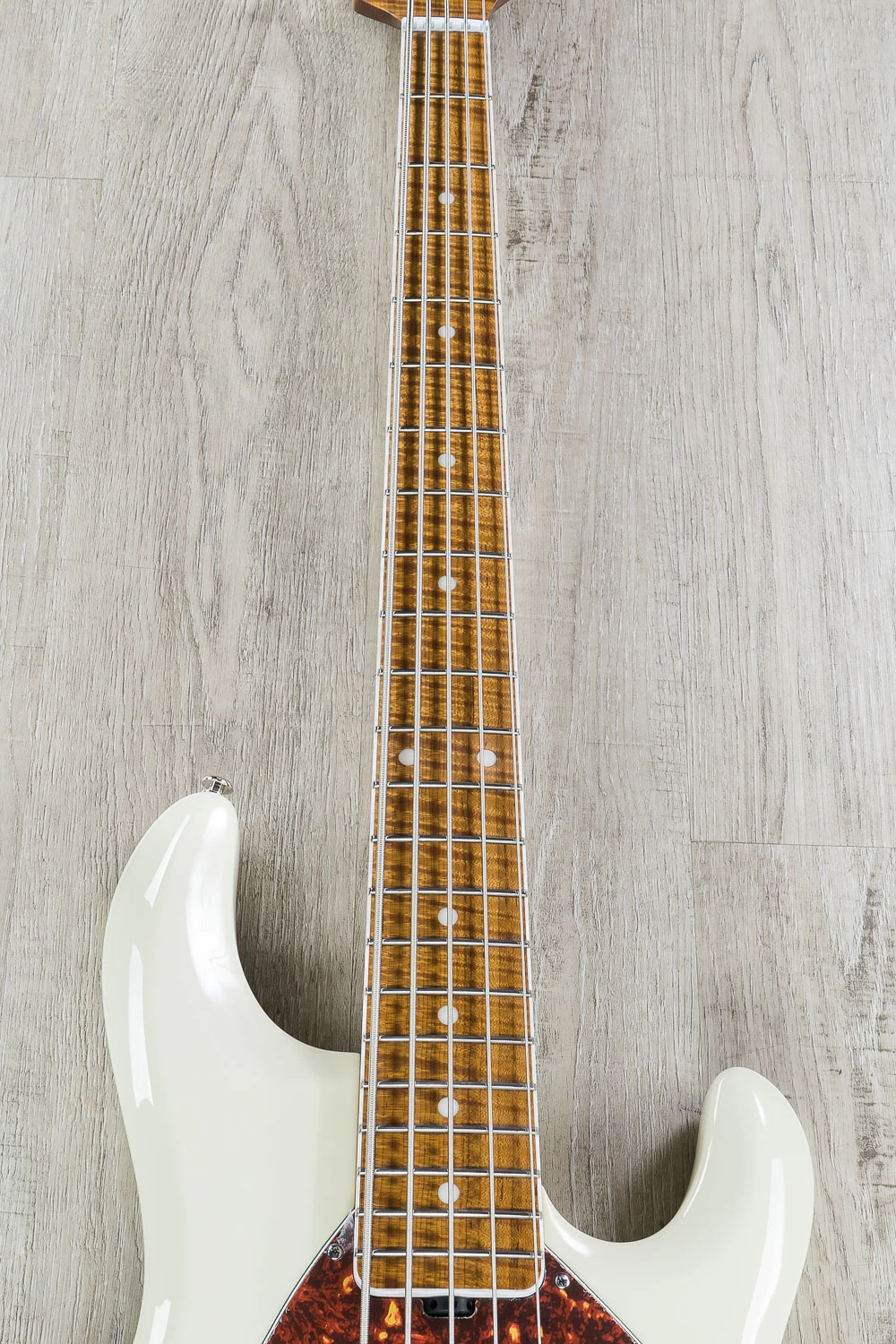 To celebrate the 30th Anniversary of the StingRay 5, Ernie Ball has come up with one of the coolest looking pieces yet! Talk about a “shut up and take my money” type of instrument… Just look at the figuring on that neck, fretboard, and headstock! To top it off, they’ve bound the roasted maple fretboard in white and put some white dots on it to top off this beautiful creation and give it a look that’s unique to other StingRays.
