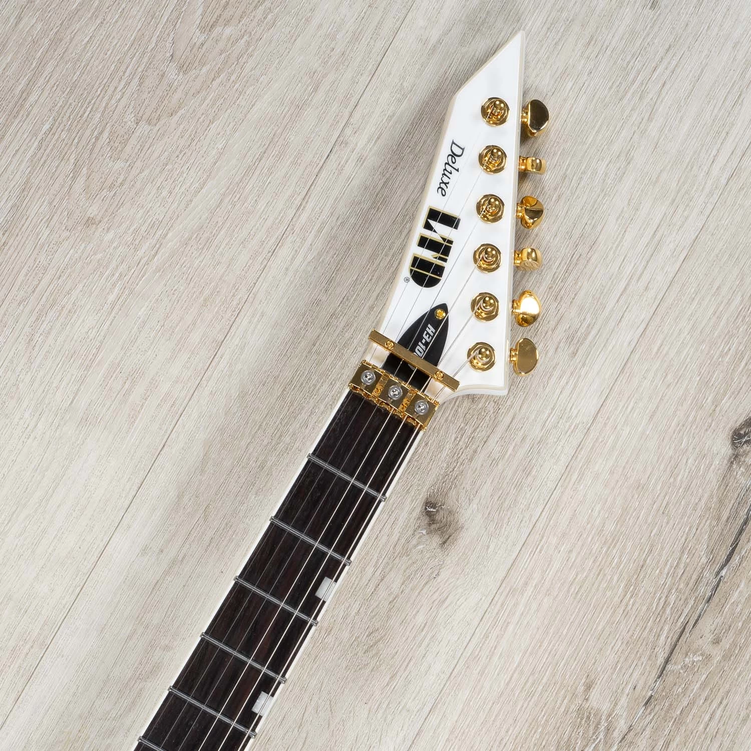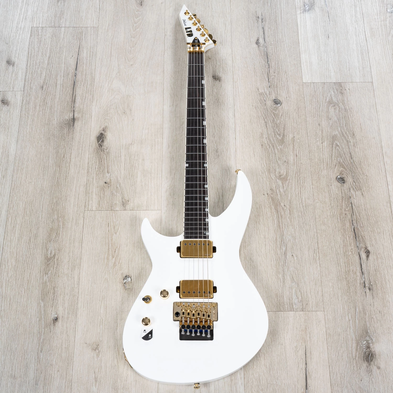 Guitars in the LTD 1000 Series are designed to offer the tone, feel, looks, and quality that working professional musicians need in an instrument. The H3-1000FR has the bold curves of the ESP Horizon-3, with an extended and beveled upper horn and a shortened lower horn that offers excellent high-fret accessibility. This guitar offers set-thru construction at 25.5” scale, pairing a mahogany body to a three-piece, extra-thin maple neck that has a compound radius for maximum speed and comfort. It also offers a bound Macassar ebony fretboard that features offset white pearloid block inlays and 24 extra-jumbo stainless steel frets. The H3-1000FR features an EMG 66TW in the neck position, splittable with push-pull control, for a tonal balance of thick, boosted mids, big lows, and singing highs. The bridge pickup is an EMG 57, with its iconic PAF tone. Both pickups are direct-mounted and have brushed gold covers to match the H3-1000FR’s gold hardware. It also includes a Floyd Rose 1000SE bridge with stainless steel screws, and Grover tuners.