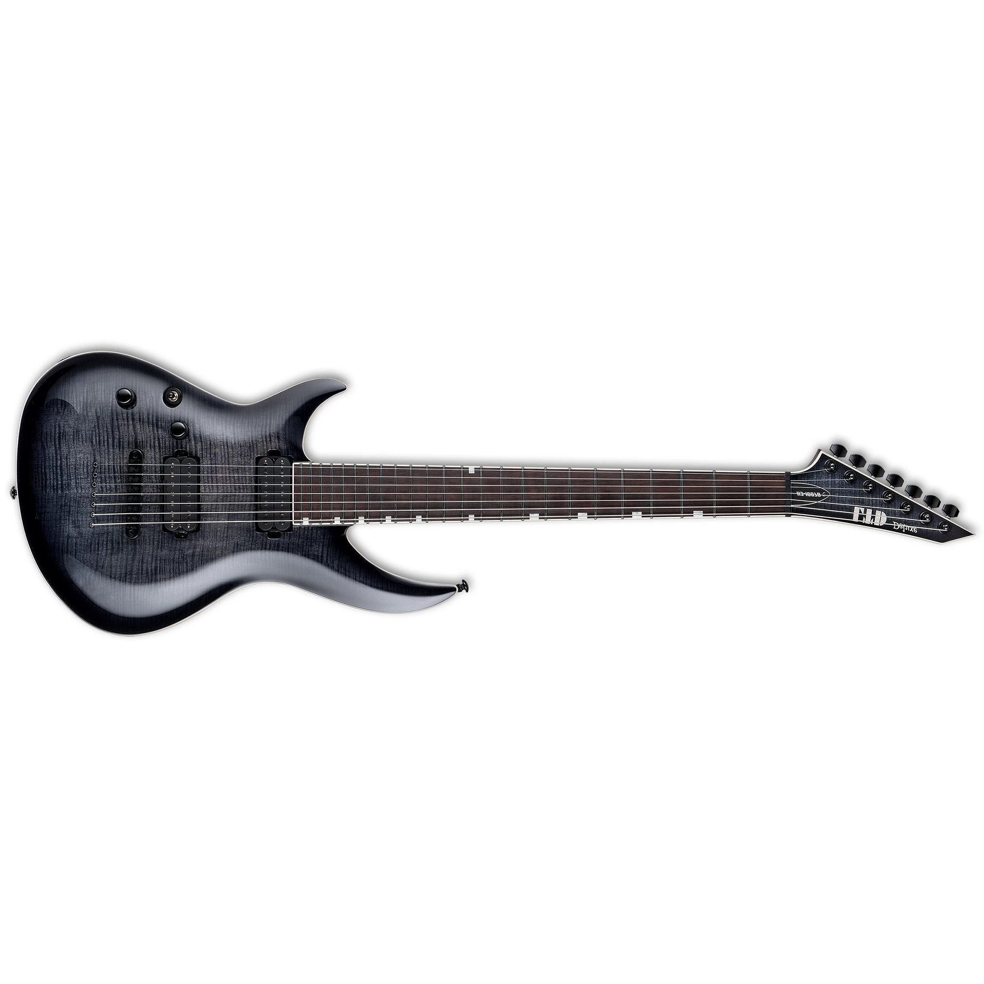 Guitars in the LTD 1000 Series are designed to offer the tone, feel, looks, and quality that working professional musicians need in an instrument. The H3-1007 Baritone is a 7-string, 27” baritone scale extended range guitar based on the shape of the ESP Horizon-3, with a longer beveled upper horn and a shortened lower horn that offers excellent high-fret accessibility. It offers a mahogany body with a great-looking flamed maple top, and a set-thru three-piece maple neck with Macassar ebony fingerboard that features offset white pearloid block inlays and 24 extra-jumbo stainless steel frets. This monster baritone gives you massive tones, driven by a set of direct-mount Seymour Duncan Sentient (neck) and Pegasus (bridge) pickups, splittable to single-coil modes with a push-pull control. Other features include LTD locking tuners and a TonePros locking TOM bridge with string-thru-body.