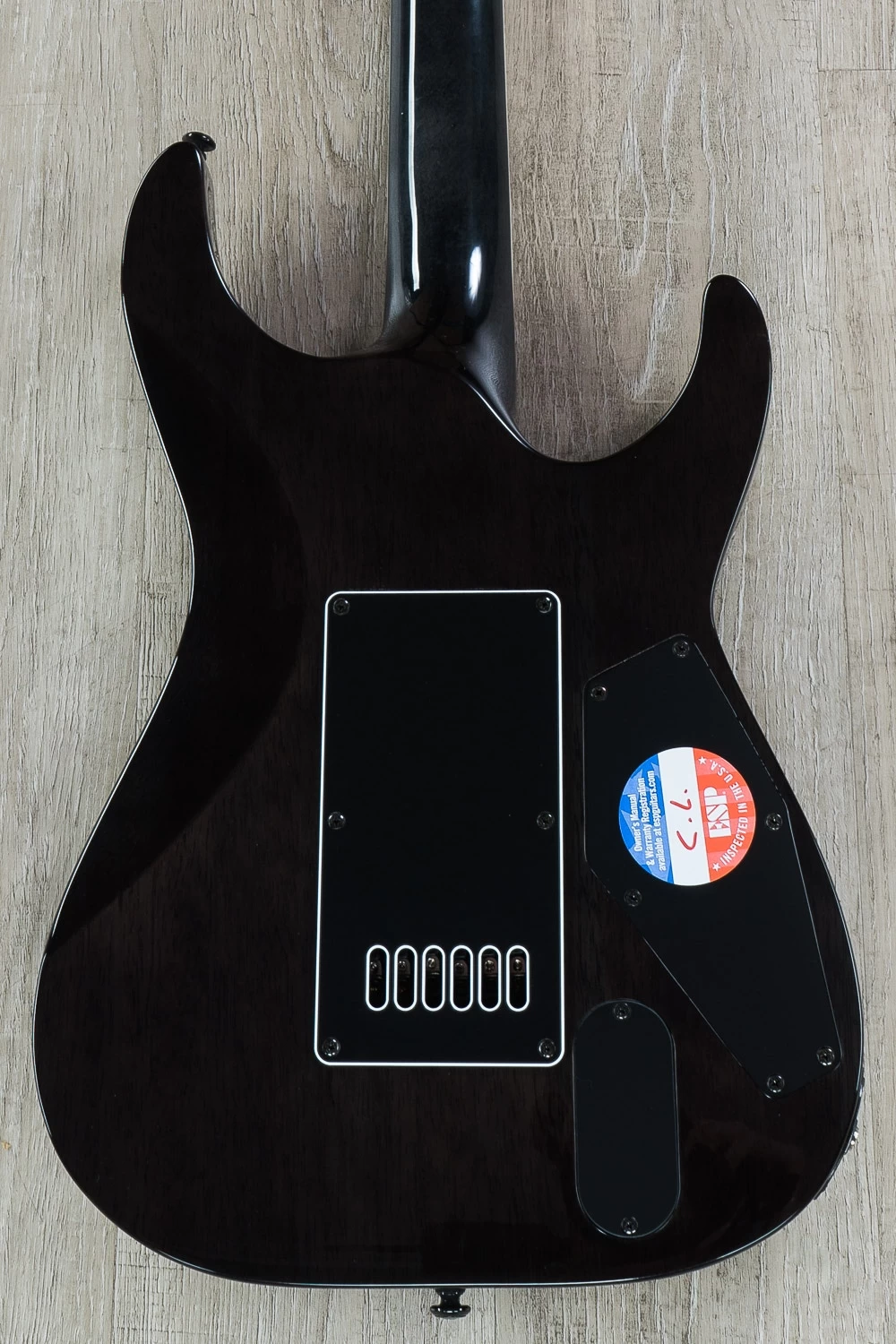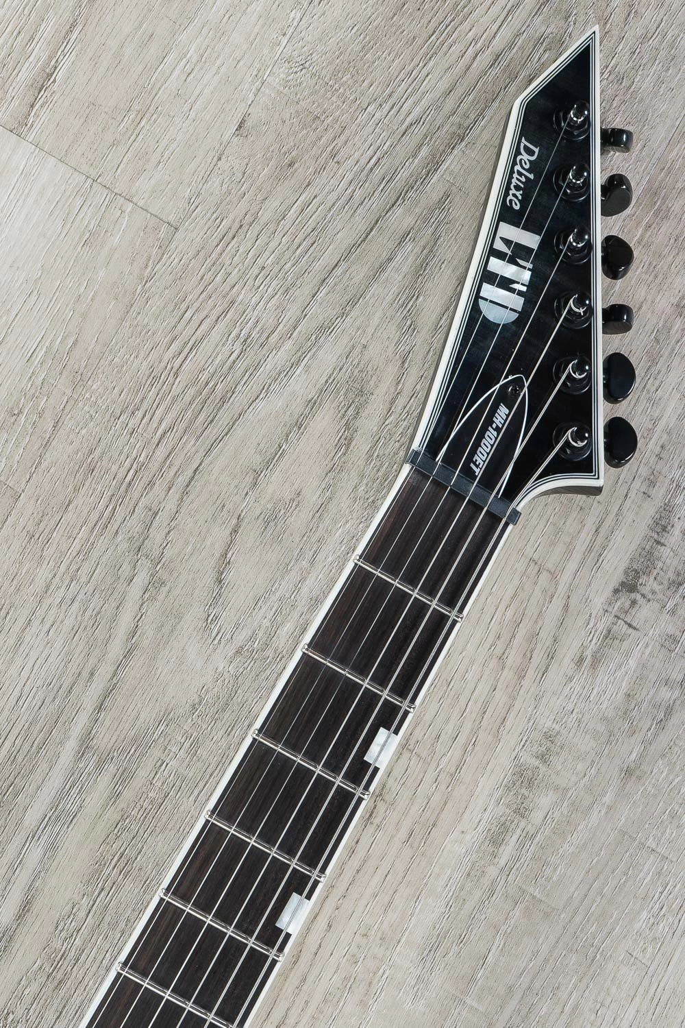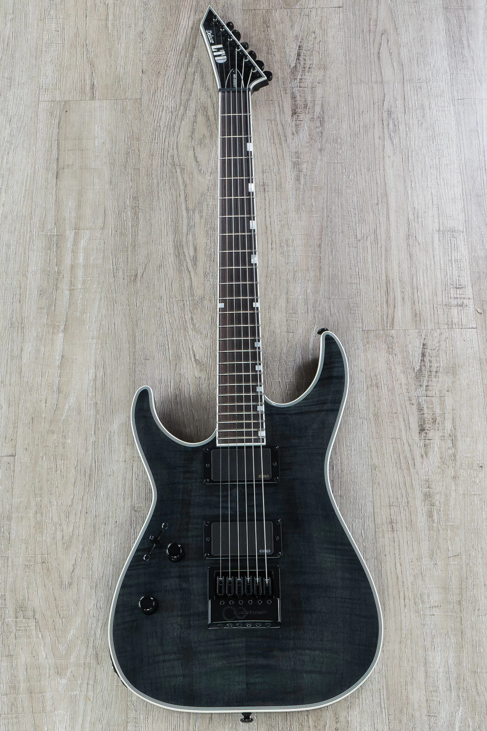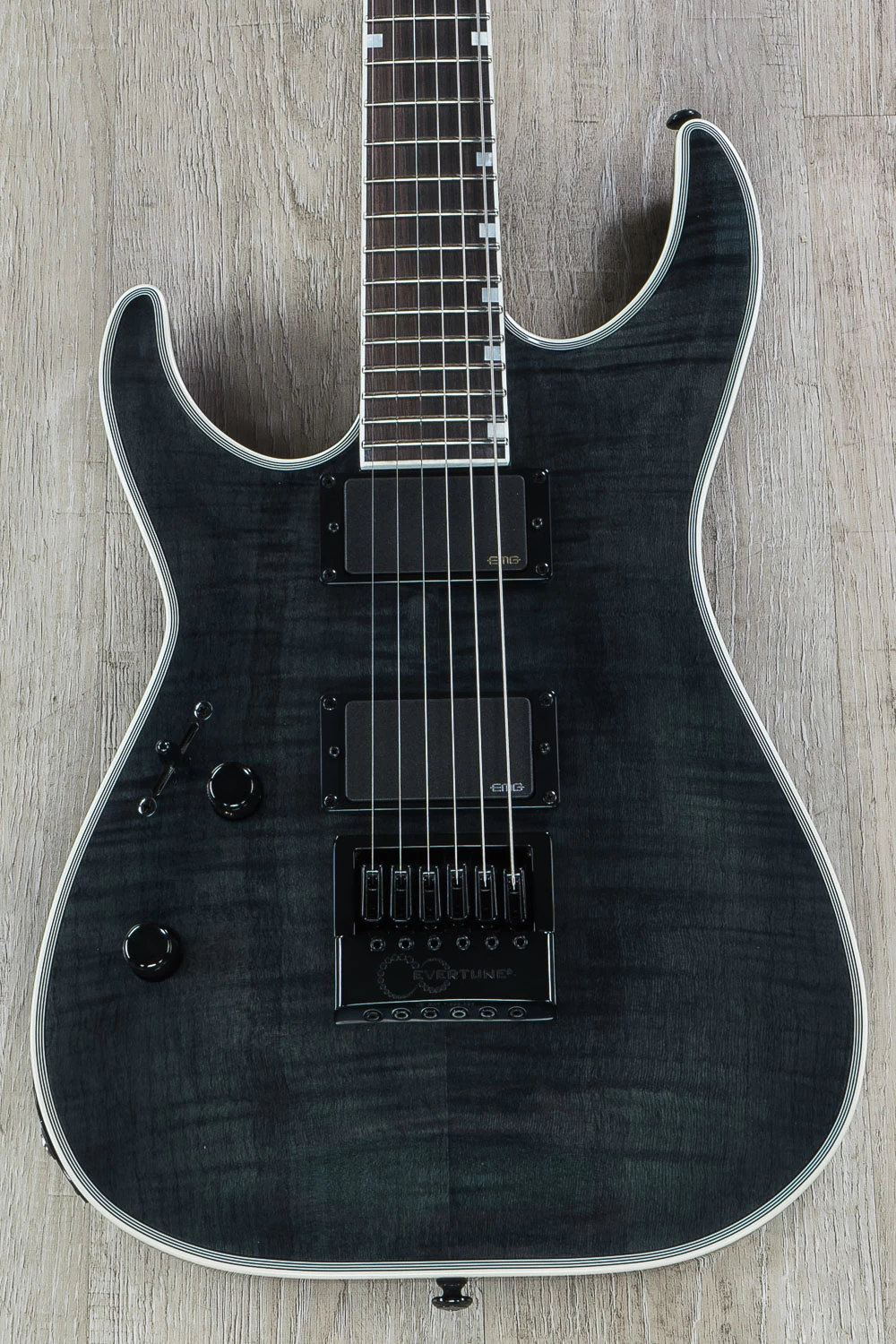 The LTD MH-1000 EverTune gives you more than you bargained for. It offers set-thru construction, meaning the neck extends deeply into the guitar’s body cavity, offering unparalleled access to the upper frets with a smooth heel joint. It has a mahogany body with a flamed maple top in a See Thru Black finish, highlighting the great look of the figured wood grain. It also features a three-piece thin U-shaped maple neck, and an ebony fingerboard with 24 extra-jumbo frets. High-class touches are included, like its multiple white binding and Grover tuners. But the MH-1000 EverTune takes things a step further with the inclusion of active EMG 85 (neck) and EMG 81 (bridge) pickup for tones that range from dark and menacing through screaming and aggressive. Finally, the EverTune constant tension bridge ensures that almost any conditions, your guitar will stay in perfect tune, and have incredibly accurate intonation at every point on the fingerboard.