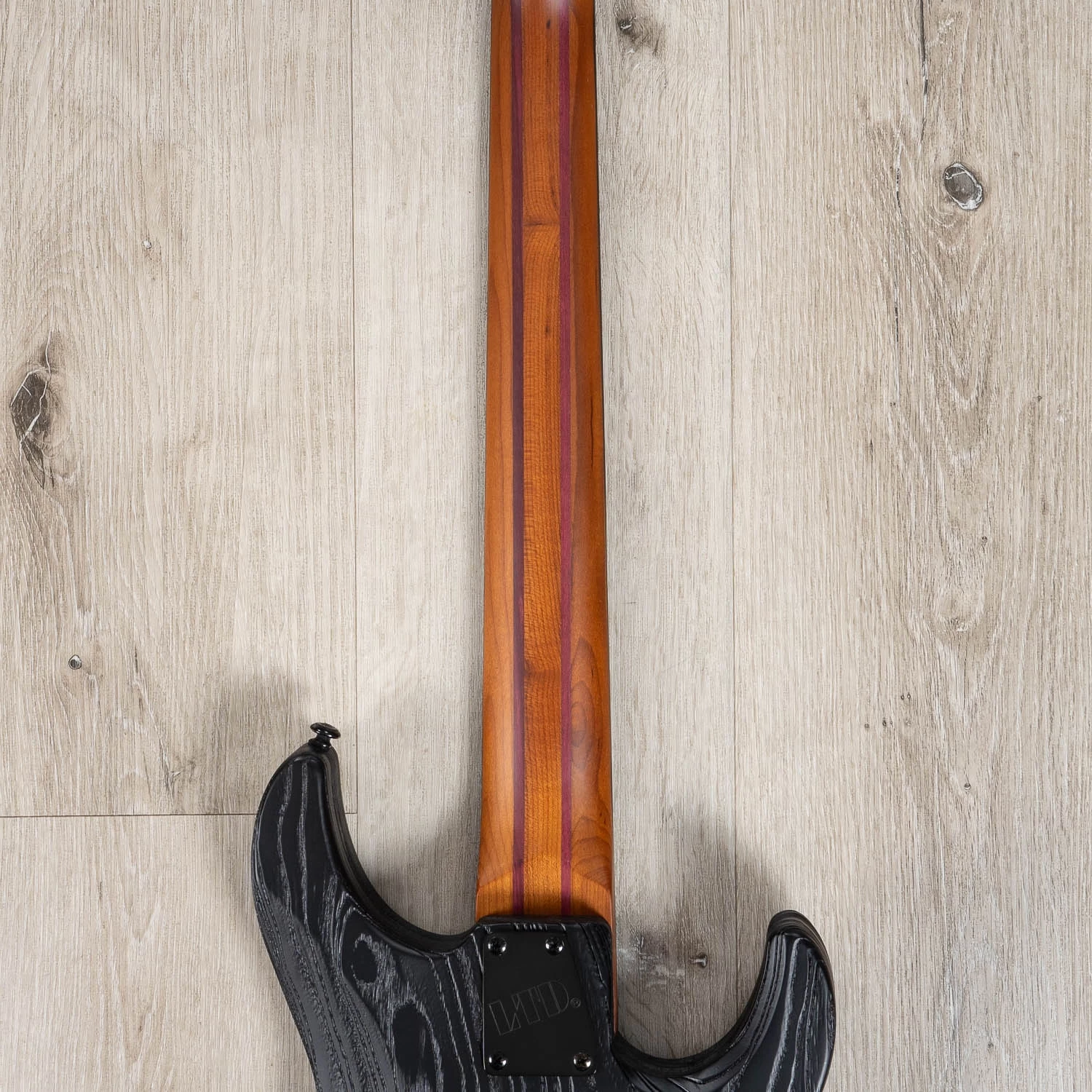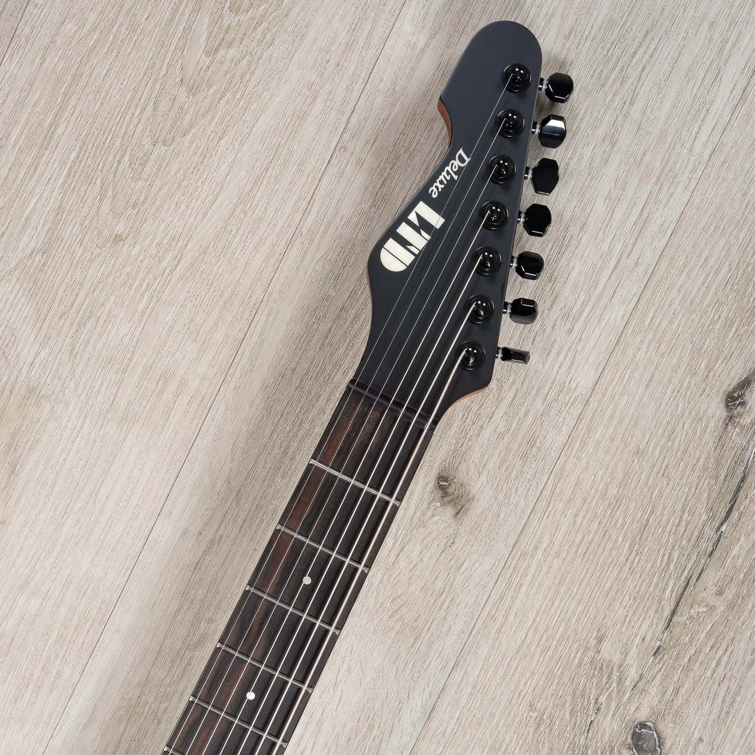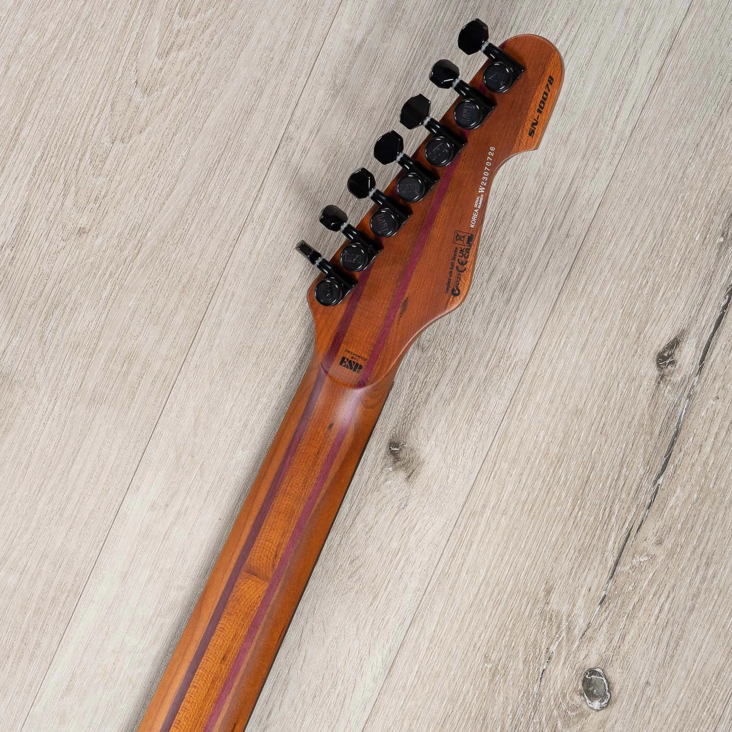 We’re stoked to offer this awesome left-handed SN-1007HT 7-string baritone from ESP LTD! Here’s a blacked-out sledgehammer that’s built for high-gain, down-tuned goodness through and through. With a tonewood combination of swamp ash, roasted maple, Purpleheart, and Macassar ebony, ESP is taking no prisoners when it comes to woods that stay tight, clear, resonant and focused acoustically. Combine that with the now-industry-standard Fishman Fluence Modern humbuckers that kick butt and take names with reckless abandon regardless of the amount of gain you throw at it, you have a lean, mean metal machine.
