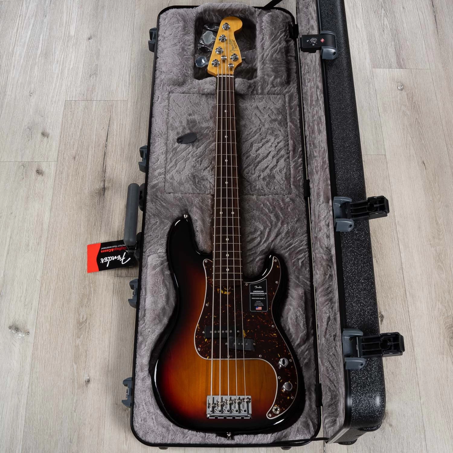 We’re proud to present this awesome Fender American Professional II Precision Bass V! This 5-string beast is in a classic 3-Color Sunburst, and throws it back to the 1960s with a rosewood fingerboard and tortoise pickguard.