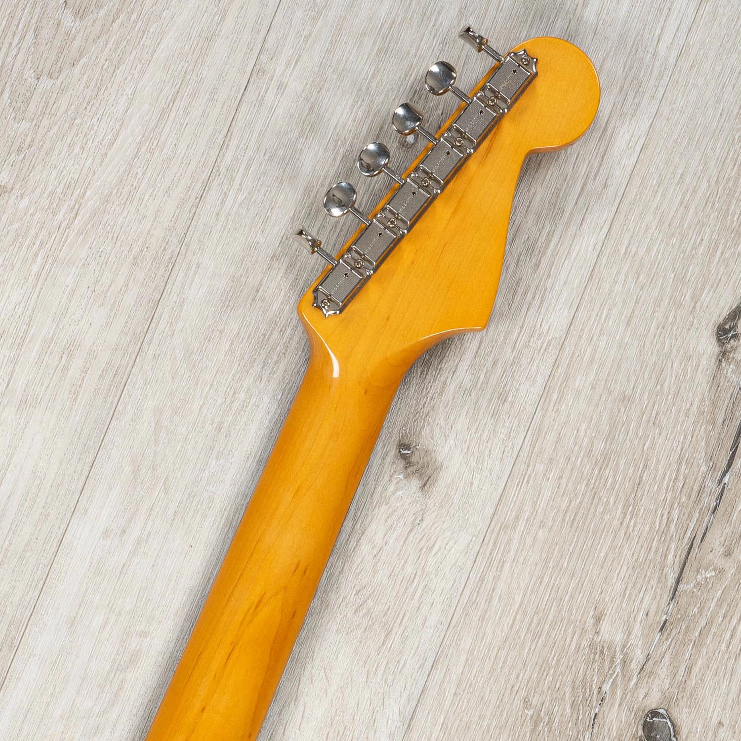 Featuring a premium alder body, a trio of Pure Vintage ‘61 Stratocaster pickups and a medium “C”-Shaped maple neck mated with a 7.25” radius slab rosewood fingerboard, the American Vintage II 1961 Stratocaster reproduces the quintessential tone and feel of the original. Other appointments include a vintage-accurate synchronized tremolo with cold rolled steel block and bent steel saddles, single-line “Fender Deluxe” tuners and 3-ply pickguard.