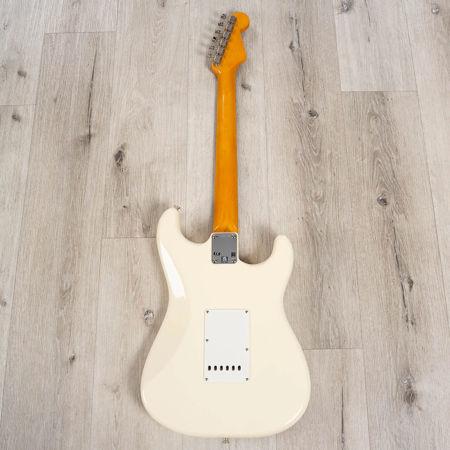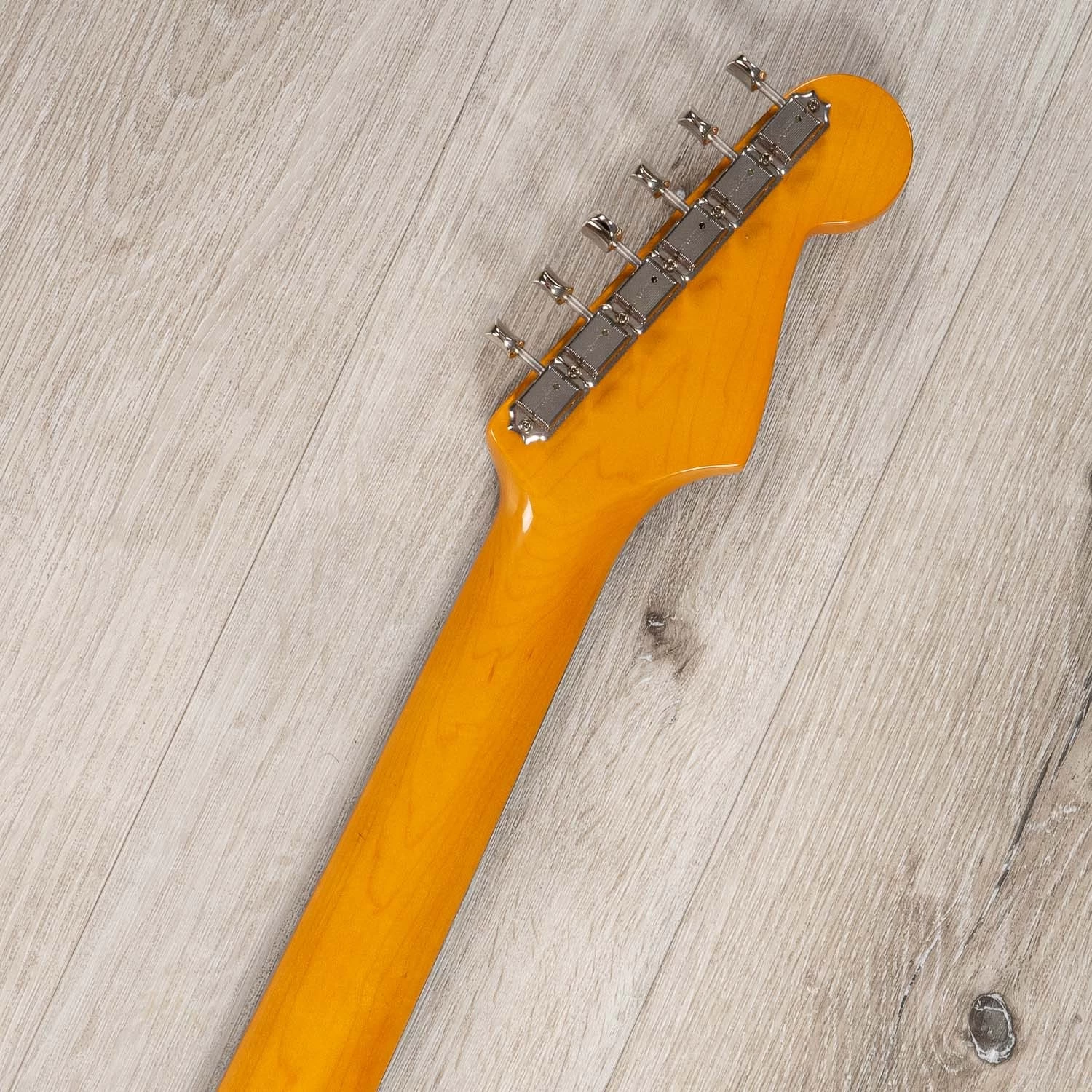 During the late ‘50s and early ‘60s, the popularity of Fender musical instruments flourished, and although the Fender assortment had expanded to include many great new instruments, the Stratocaster reigned supreme. By 1961, the Stratocaster had taken on a more refined aesthetic, with a 3-Color Sunburst reformulated with a more vibrant red and bolder black edge, topped with a 3-ply pickguard accenting the Strat’s signature curves.