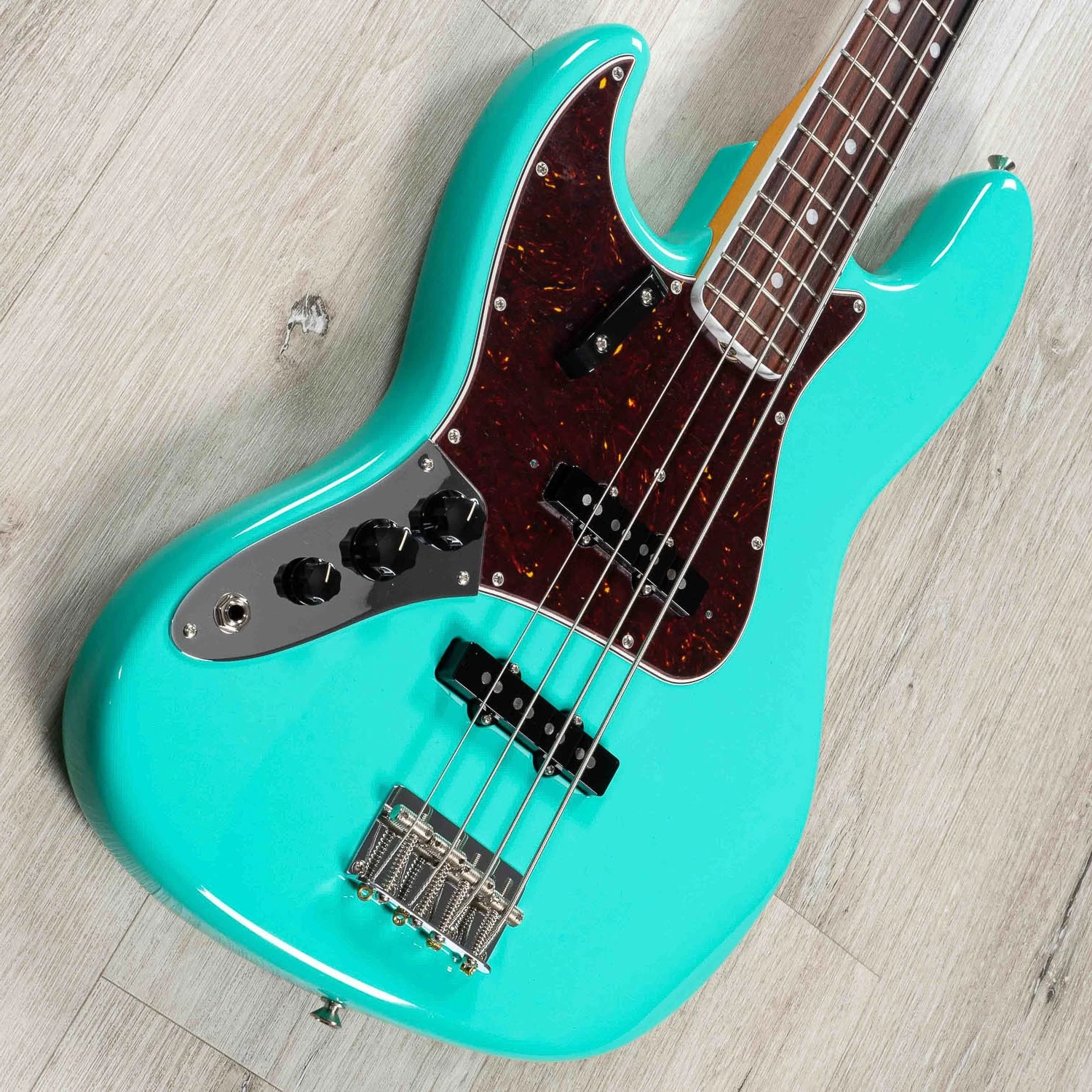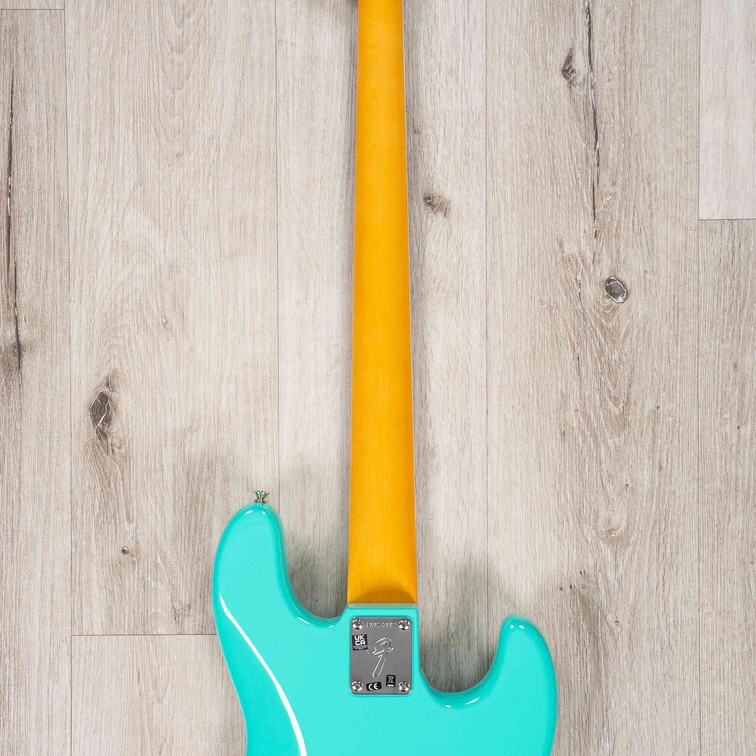 This bass looks awesome – Seafoam Green is one of our favorite Fender colors here at the shop, and it looks absolutely exquisite with a matching headstock and tortoise pickguard against the bound round-lam rosewood fingerboard. This is definitely one of the most exclusive, “Custom Shop”-looking models in the American Vintage II line.