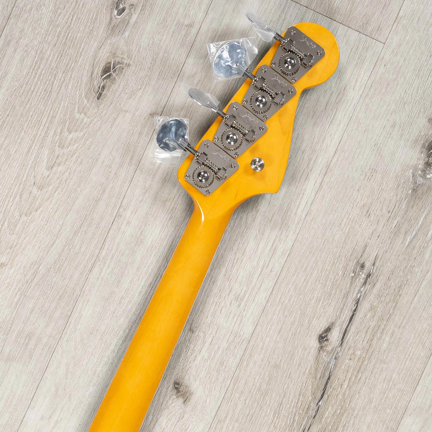 The American Vintage II 1966 Jazz Bass features a comfortable “U” shape hard rock maple neck, and it plays like a dream with a 7.25” radius round-lam rosewood fingerboard and vintage tall frets. Characteristic of production in 1966, this J-Bass® is offered with white neck binding, pearl dots, two volume controls with master tone, matching painted headstock and 4-ply tortoiseshell pickguard. The 4-saddle bridge with threaded saddles, vintage-style “lollipop” tuners and Pure Vintage ‘66 Jazz Bass pickups deliver classic thump and style.