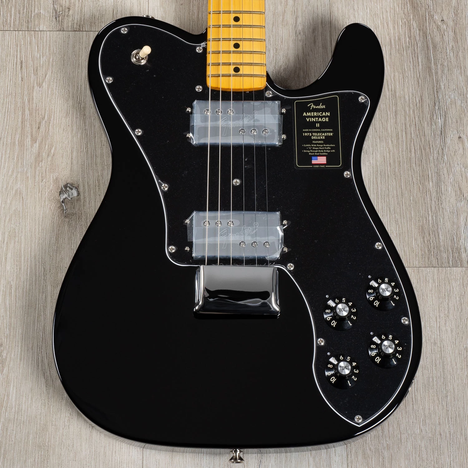 Initially introduced in 1972 and billed as the top model in the Telecaster® family, The Telecaster Deluxe holds the distinction of being Fender’s first solid-body Telecaster with two humbucking pickups. Like the original, the American Vintage II 1975 Telecaster Deluxe sports a large Stratocaster®-style headstock, a ’75 “C”-shape maple neck, a comfort-contoured belly cut, and pair of CuNiFe Wide Range humbucking pickups mounted to an elongated pickguard with dual volume and tone controls and a 3-way toggle located on the upper bout. Also characteristic of production in 1975, this Telecaster is outfitted with a convenient “Bullet” style truss rod nut, three-bolt neck plate with Micro-Tilt™ mechanism and offered in Black, Mocha Brown, or 3-Color Sunburst over an alder body. Other features include a 6-Saddle hardtail bridge with stainless steel block saddles and vintage-accurate Tele® Deluxe tuners.