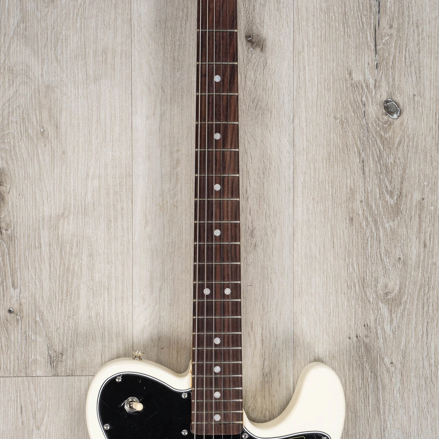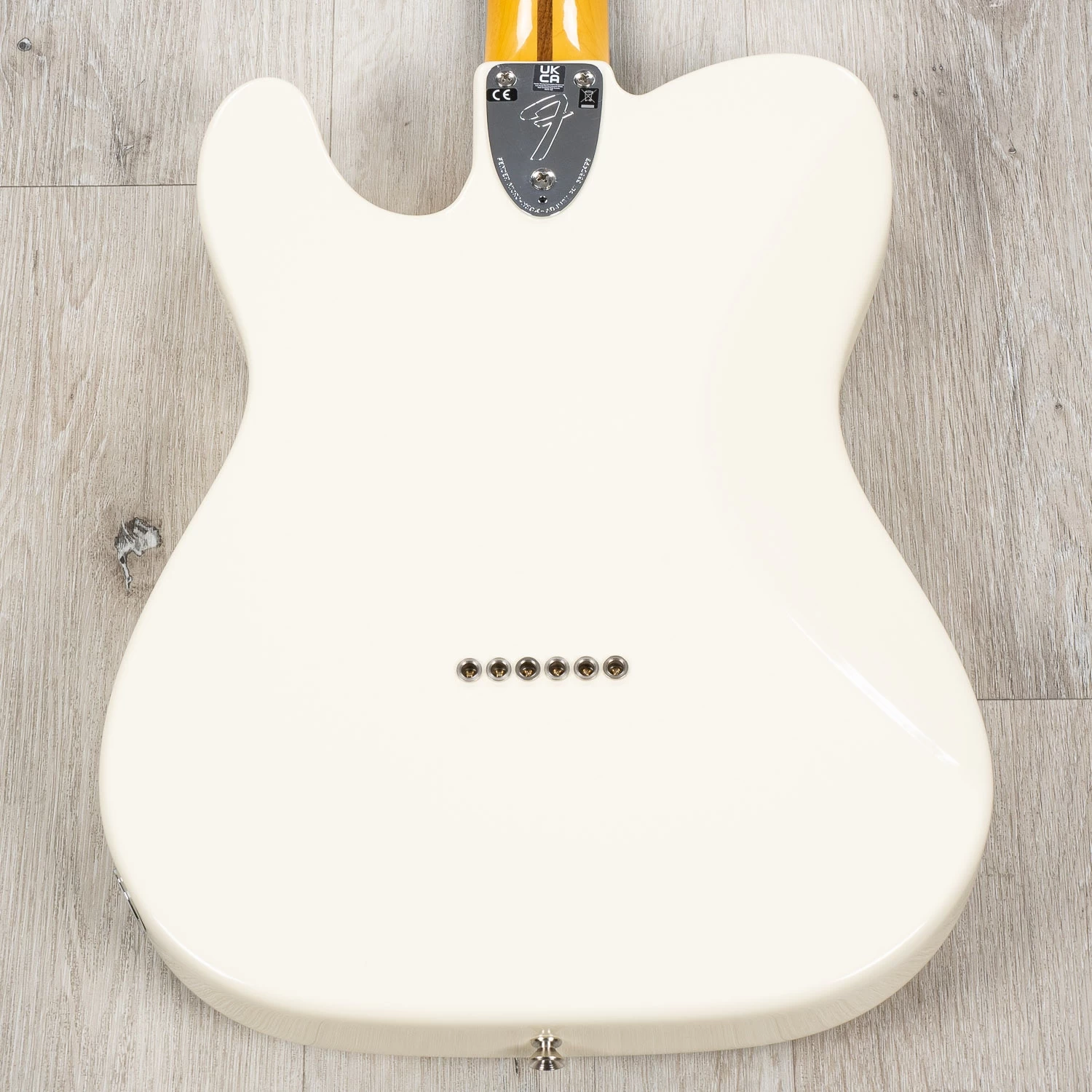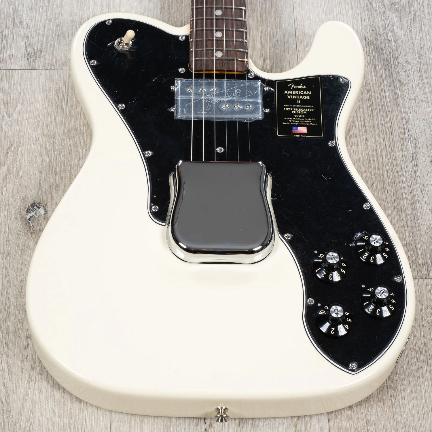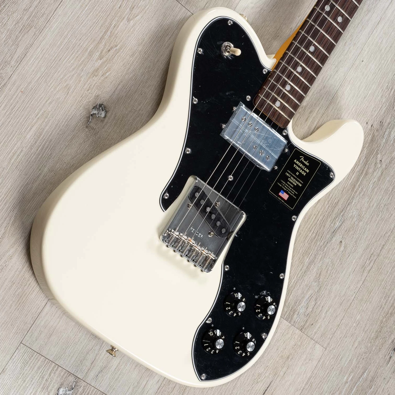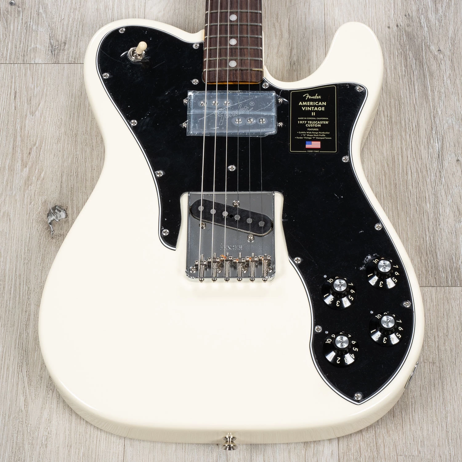 The Limited Edition American Vintage II 1977 Telecaster Custom sports a ’77 “C”-shape maple neck, a comfort-contoured belly cut, and a refreshed pickup configuration of a Pure Vintage ’77 single-coil bridge and CuNiFe Wide Range neck mounted to an elongated pickguard with dual volume and tone controls and a 3-way toggle located on the upper bout. Also characteristic of production in 1977, this Telecaster is outfitted with a convenient “Bullet” style truss rod nut, three-bolt neck plate with Micro-Tilt™ mechanism and offered in Olympic White over an alder body. Other features include a 6-Saddle hardtail bridge with stainless steel barrel saddles and vintage-accurate Tele Custom tuners.