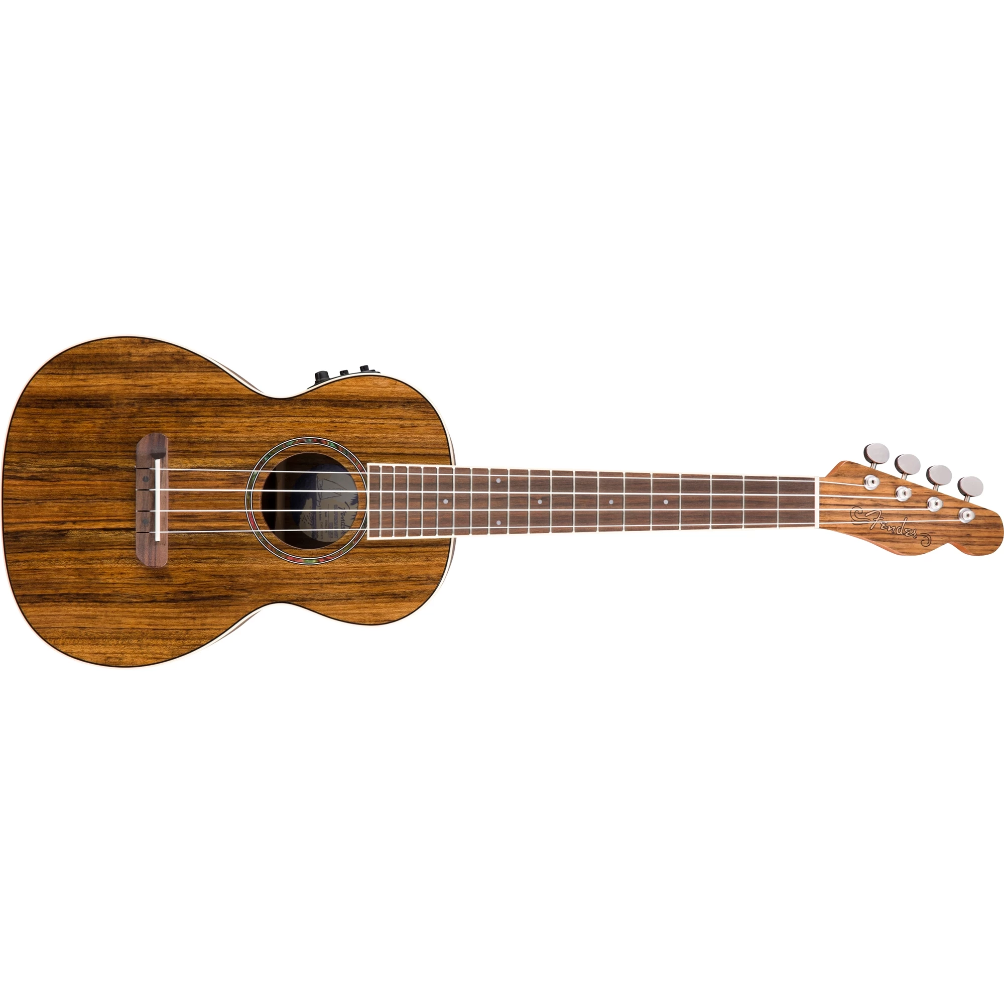 Crafted from ovangkol, with a solid top for enhanced volume, this ukulele sings with full-bodied chime while boasting a natural appearance. A no-tie bridge, bone nut and saddle, and eye-catching abalone rosette round out the modern features. The Rincon V2 now features a 4-in-line Tele® headstock with vintage-style closed-back tuning machines, for that unmistakably classic Fender look.