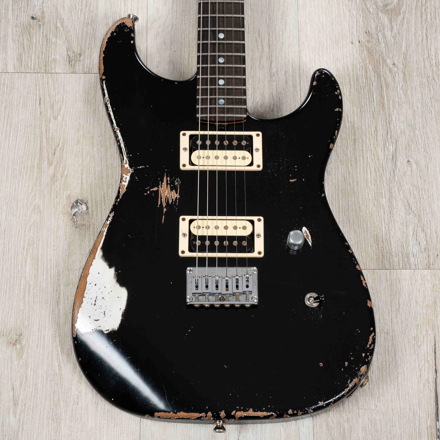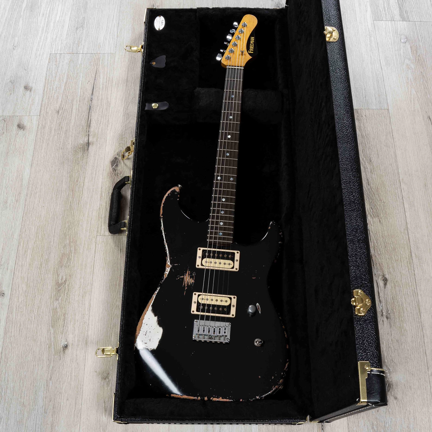 A true nod to hot-rodded guitars of old, this absolutely killer Friedman Cali “Superstrat”-style axe marries old-school hard rock tone with impeccable playability. This one’s in a tasteful Medium-Aged Black finish.