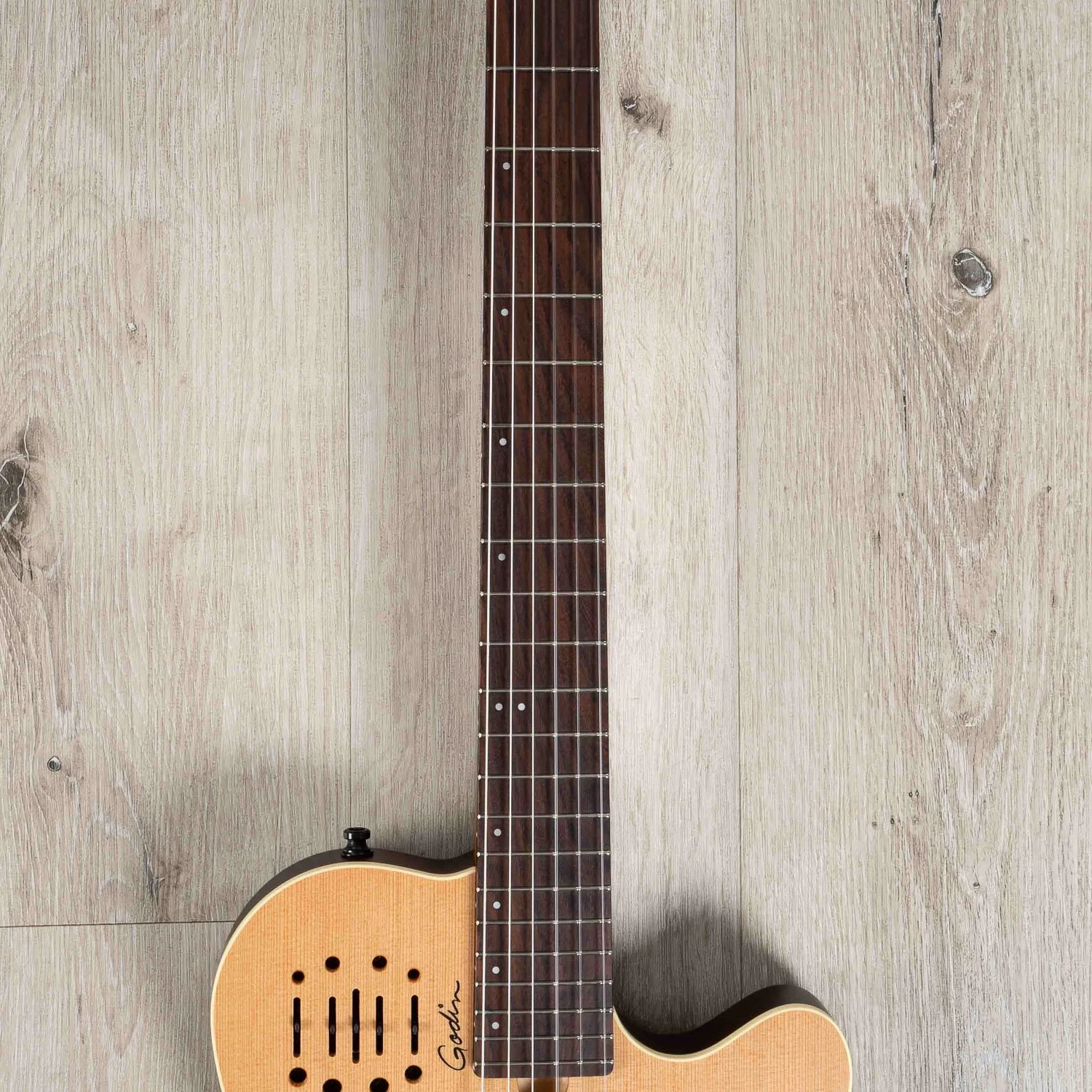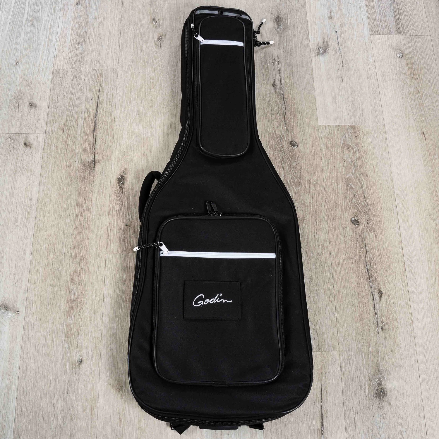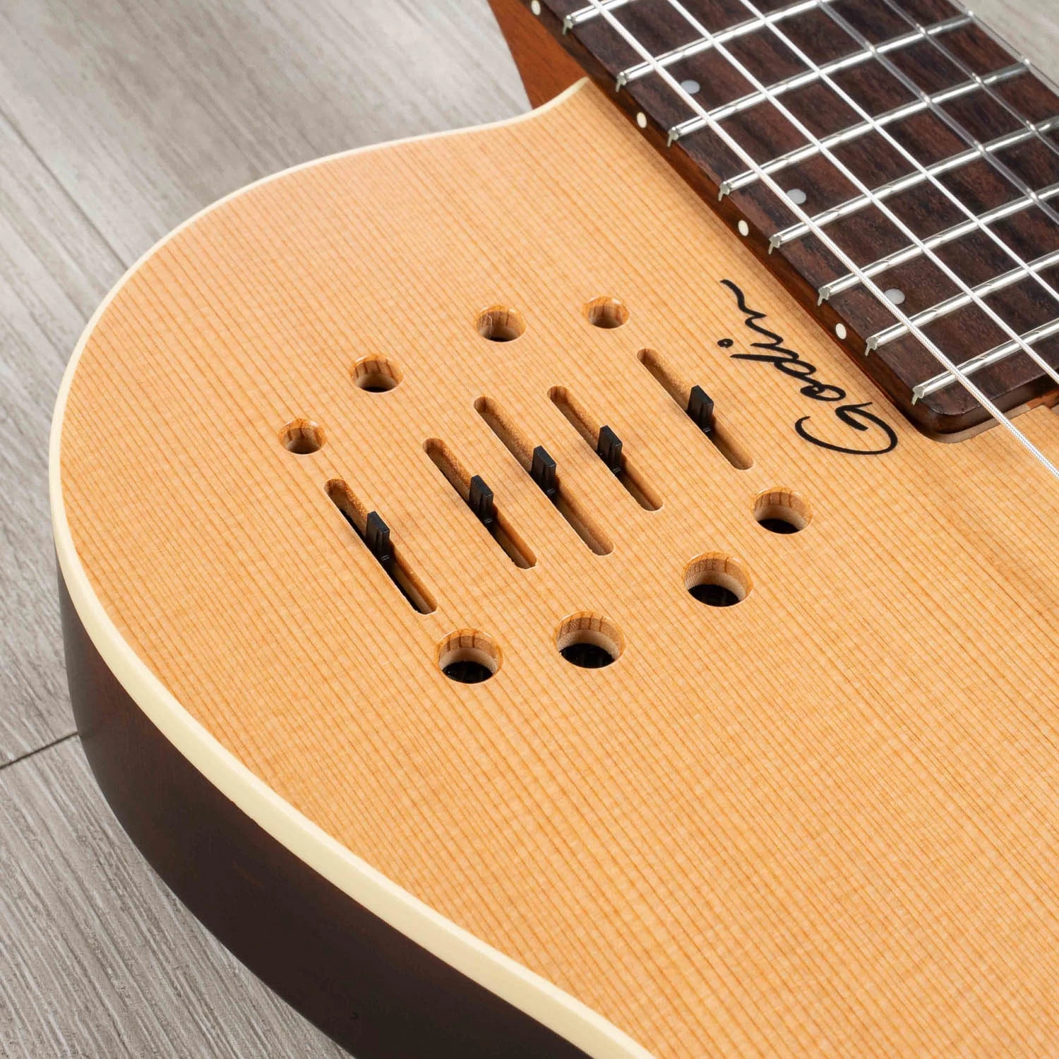 - Pickup/Preamp: 2 body sensors, Custom Godin Dual Source System, undersaddle bridge