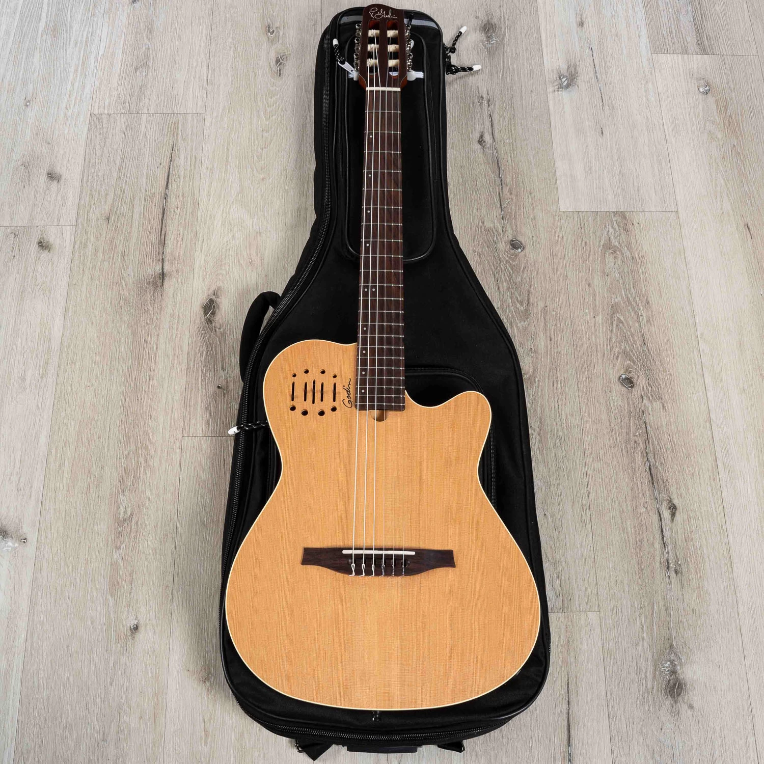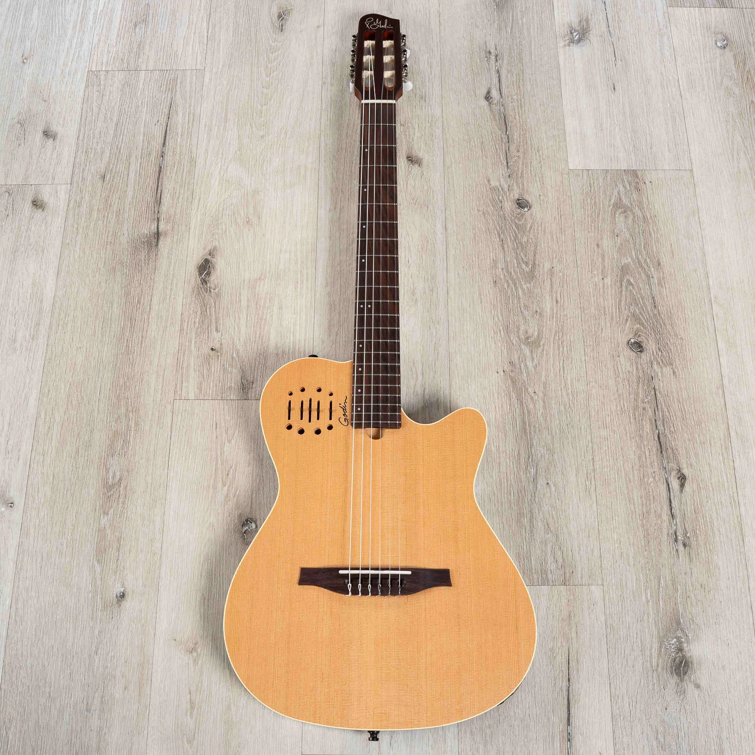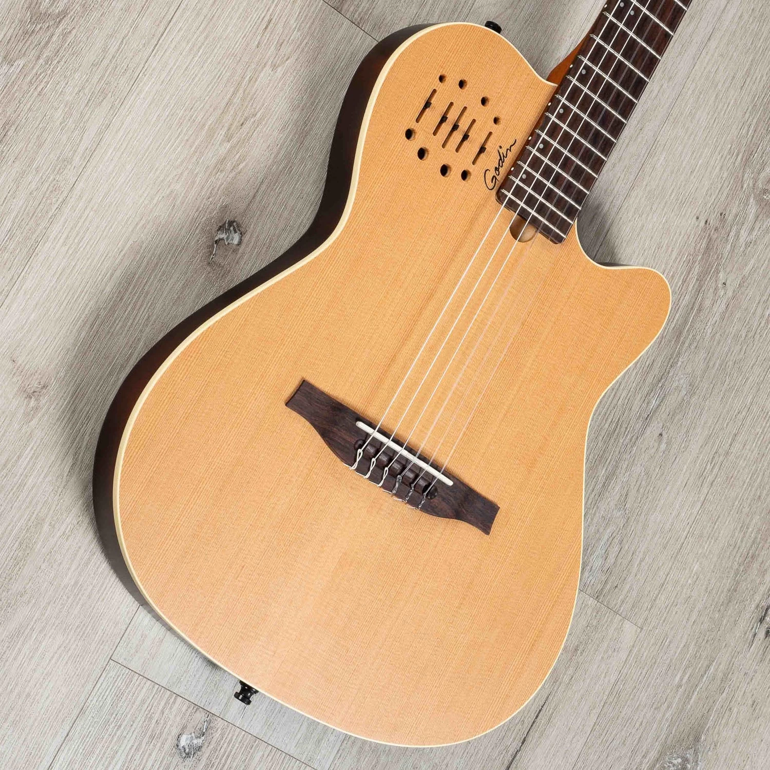 - Pickup/Preamp: 2 body sensors, Custom Godin Dual Source System, undersaddle bridge