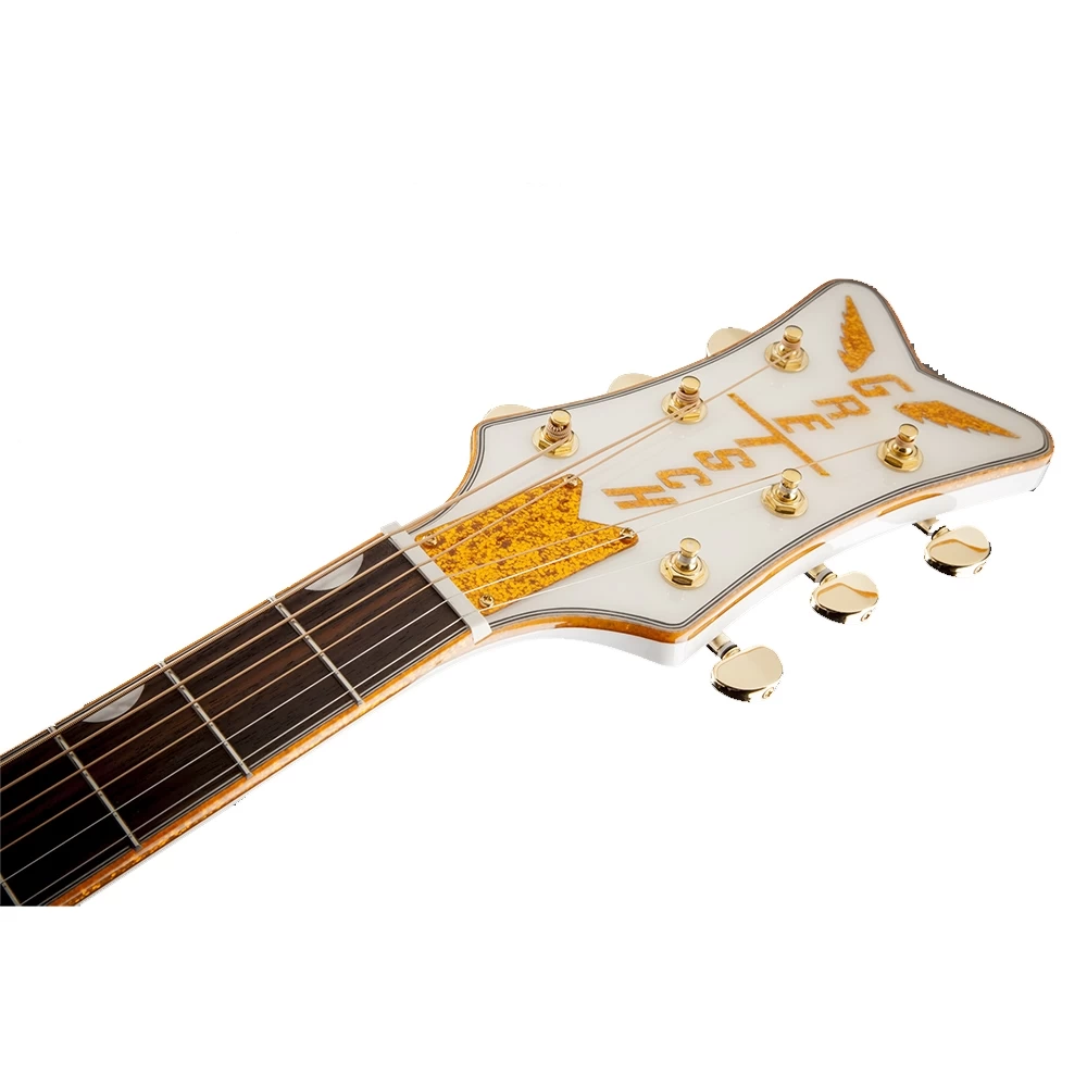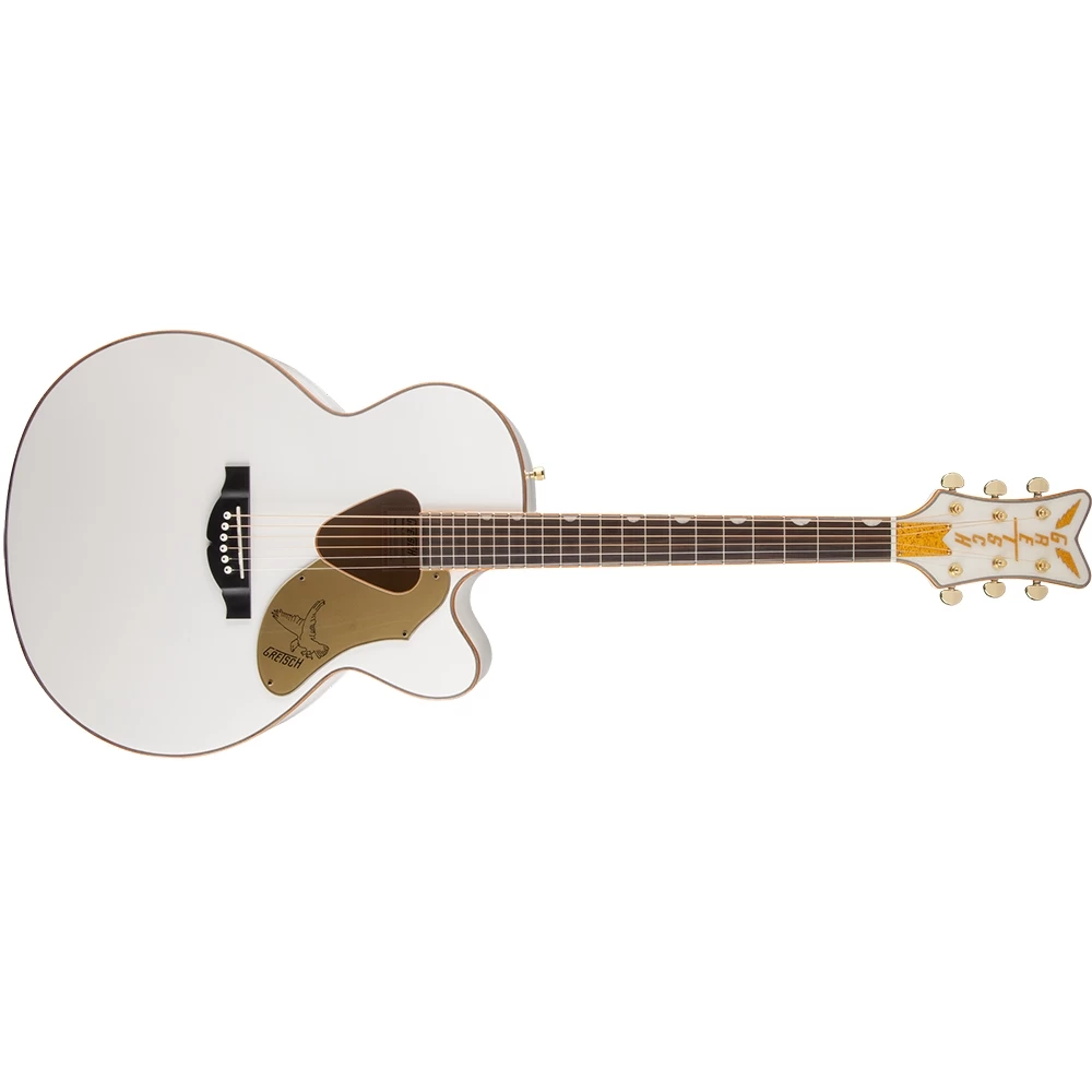 - Unique Features: V-Shaped Matching White Painted Falcon Headstock with Gold-Sparkle Inlaid Gretsch Vertical Winged Logo, Traditional Gretsch Rancher “Triangular” Sound Hole, Gold Sparkle Bound Body Neck and Headstock with B/W/B/W Purfling, Gold Sparkle Heel Cap, Synthetic Bone Nut, Knurled Strap Retainer Knobs, Adjustable Truss Rod with Headstock Adjustment