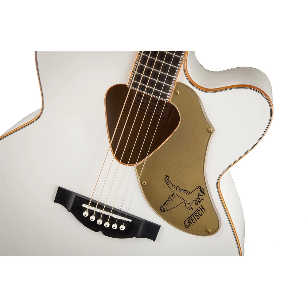 Its jumbo cutaway body includes dazzling gold-sparkle binding on the top, back, sound hole, fingerboard and headstock. Other premium features include a solid spruce top with scalloped “X”-bracing and classic Rancher triangular sound hole, maple sides and arched back, mahogany neck, 21-fret rosewood fingerboard with Neo-Classic™ “thumbnail” inlays, “V”-shaped headstock with vertical winged “Gretsch” sparkle logo, compensated bridge with rosewood base, deluxe tuners, and gold-plated hardware. The Fishman® Sonicore under-saddle pickup and Isys+ preamp system provide great amplified performance and flexible sonic control, with volume, tone and phase controls, onboard tuner and battery life indicator.