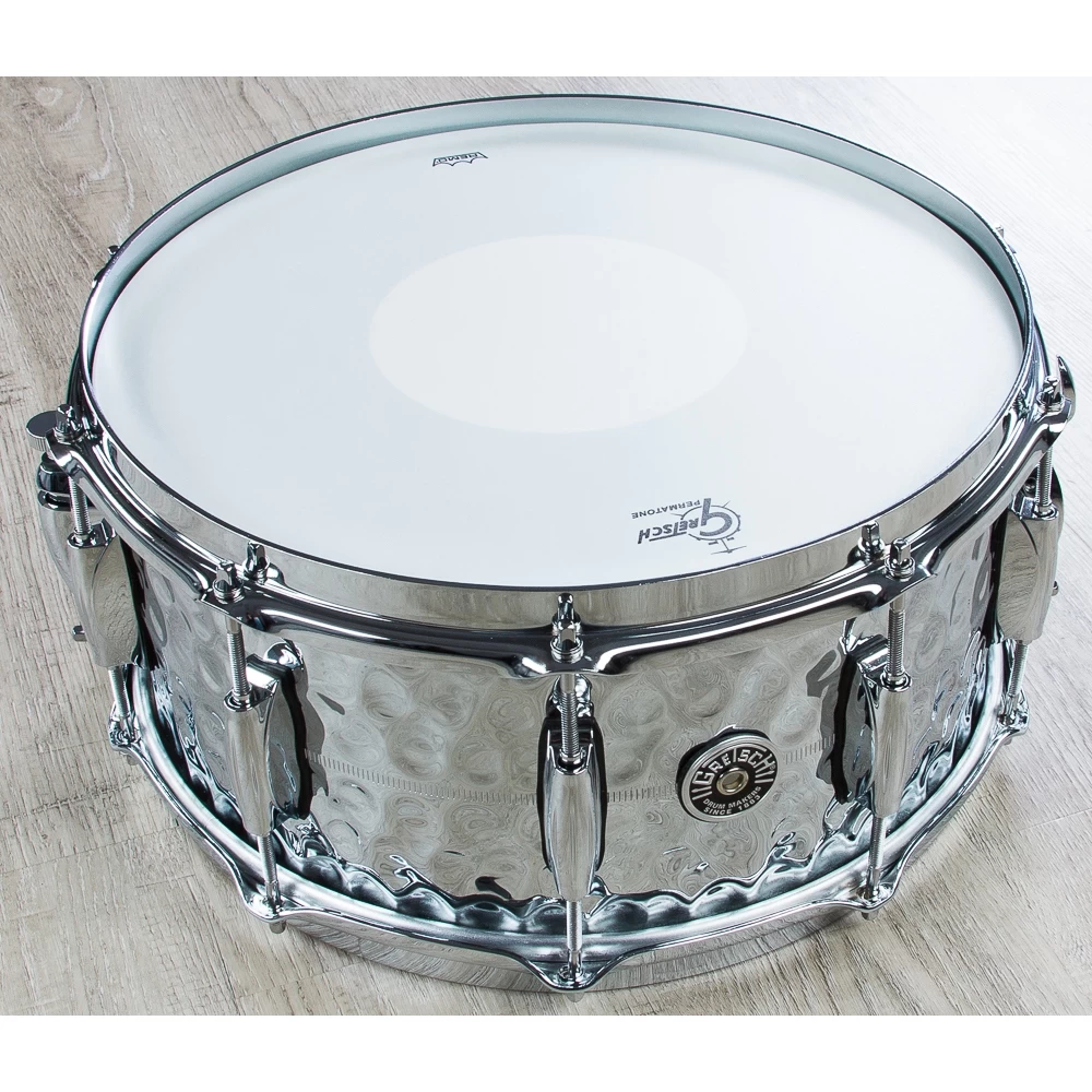 (10 lug). Also offered is hammered chrome over brass shell in 6.5×14 (10 lug). All shells include Gretsch “302” 3mm/double-flanged hoops, Lightning throw off and butt plate, “Snap-in” drum key holder, 20-strand snare wire and Gretsch Permatone drum heads. The brass shells resonate with classic, musical tones and are extremely versatile. The “302” hoops provide a timbre that is more open and ambient than traditional Gretsch die-cast hoops.