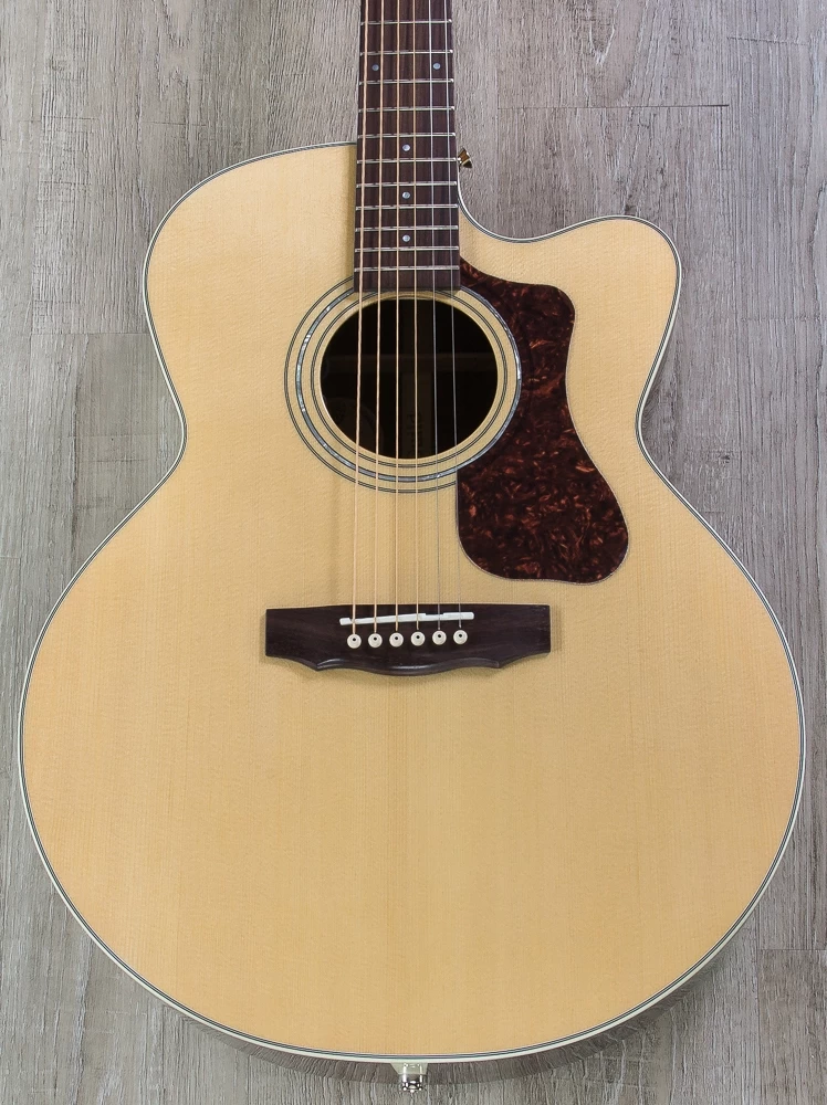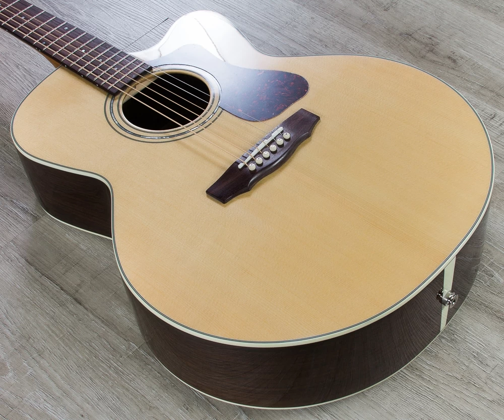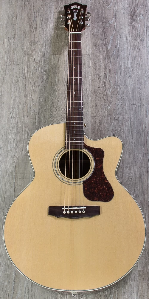 With their large, rounded bodies, Guild’s jumbo acoustic guitars have been prized for their volume, projection, and balance ever since the F-50 model debuted in 1954. The F-150CE upholds this tradition with its solid Sitka spruce top, solid Indian rosewood back and sides, elegant cutaway, and powerful Fishman Sonitone pickup. Additional features include an Indian rosewood fingerboard and bridge, bone nut and saddle, and mother-of-pearl rosette. This model also has a 1¾” nut width on a vintage shaped Guild neck, iconic Chesterfield headstock emblem reminiscent of 1960s Guilds, period-correct tortoiseshell pickguard, and Guild’s new lightweight polyfoam case. Available in Natural gloss finish.