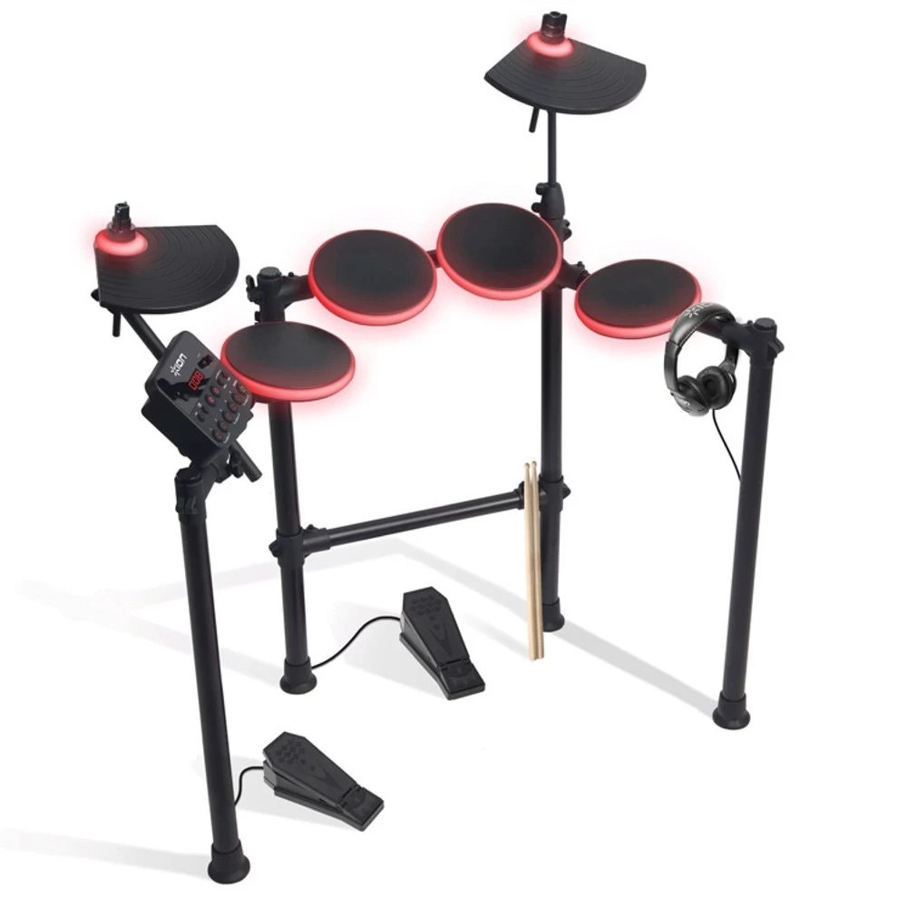 ION Redline Drums feature LED drum and cymbal pads that will have you playing like a pro in no time. In addition to 200 sounds, Redline Drums contain a built-in drum coach with play-along patterns and exercises to improve your skills. Through stereo 1/4-inch outputs, Redline Drums can be easily connected to an amplifier or sound system to share your performance. Thereโs also a 1/8-inch headphone output, so you can play anytime, day or night.