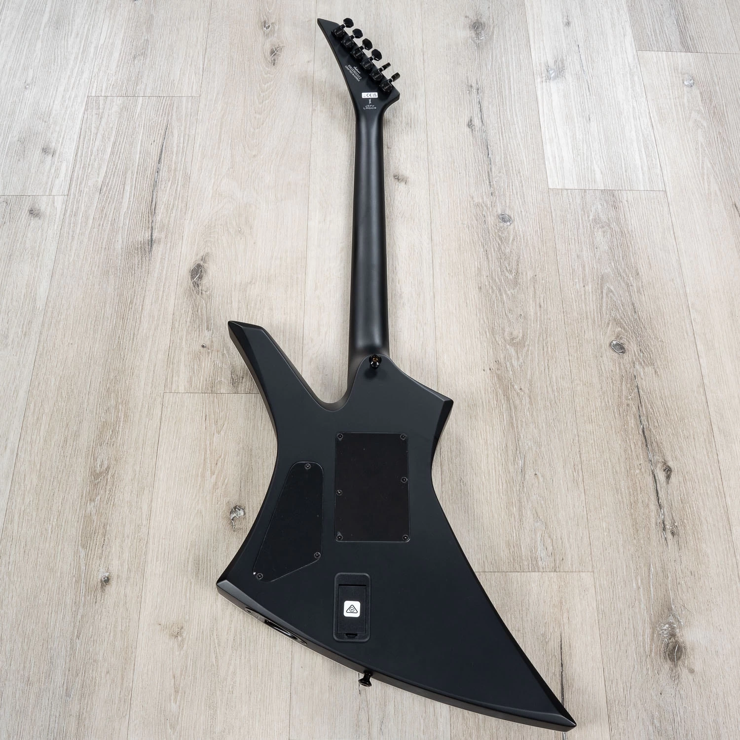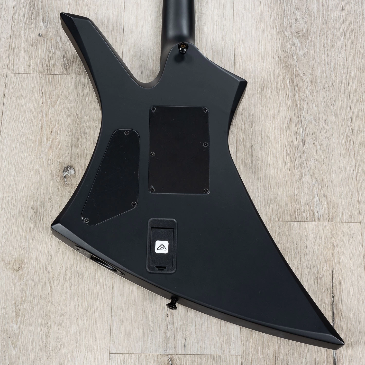 This aggressive signature axe features a basswood body with a sandblasted ash top finished in Black with white binding for a distressed and menacing look. Through-body maple neck construction creates grater sustain and includes graphite reinforcement for the utmost stability against the rigors and ravages of the road. Shaped for speed, its bound 12”-16” compound radius ebony fingerboard hosts 24 jumbo frets and stylish pearloid sharkfin inlays. Luminlay® side dots will help you find your way along the fretboard even on the darkest of metal stages, while a heel-mount truss rod adjustment wheel makes for quick and painless neck relief tweaks.