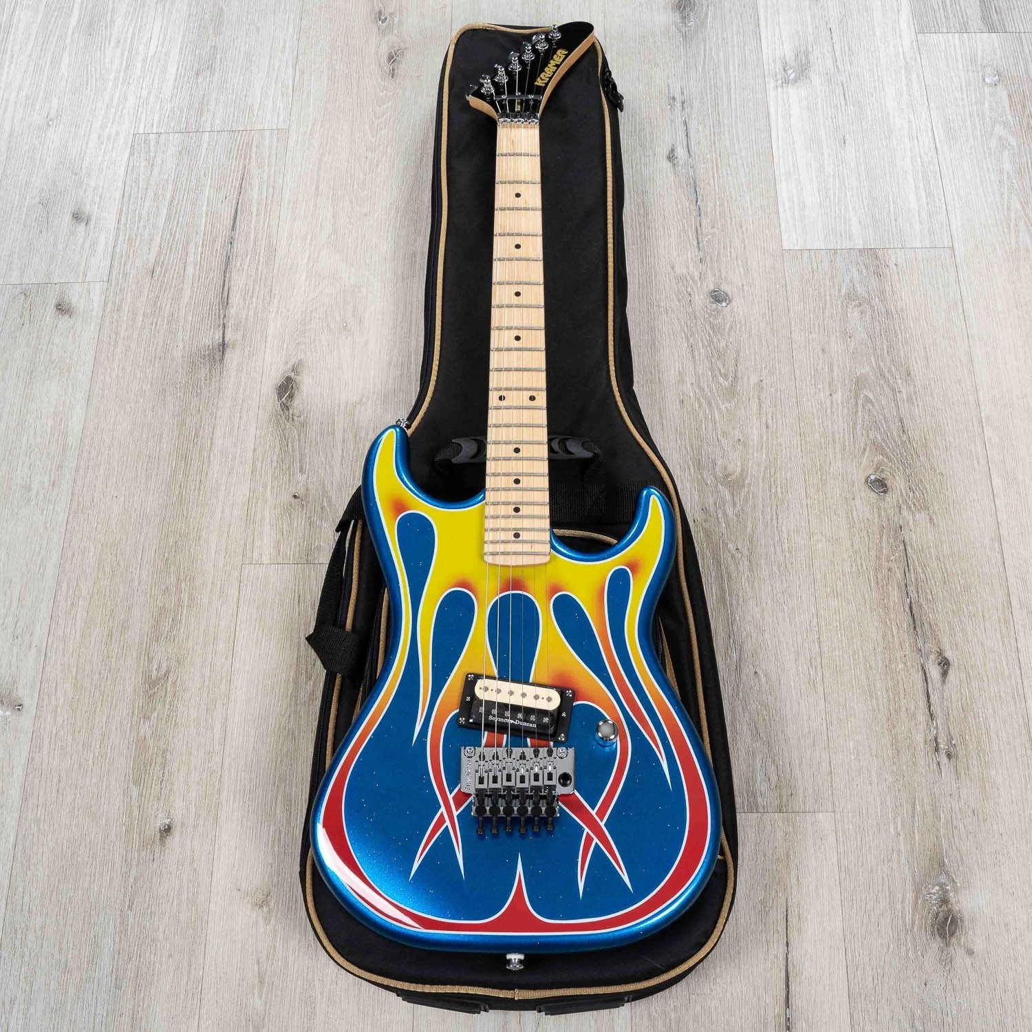 With custom graphics designed by Kramer Custom Graphic Artist Chris Stemmer, the hand-painted original was displayed at the 2020 Winter NAMM Show Kramer exhibit and is now available to everyone. Inspired by glittery, hot-rodded collectible toy cars from the 1960s, the graphics of this Baretta, already one of the “fastest metal guitars in the world,” really make it look the part! This Baretta is part of the Kramer Custom Graphics Collection and is a tribute to one of the most iconic and original guitar designs in rock. Featuring an alder body, hard maple neck, a single Seymour Duncan® JB™ zebra-coil humbucker™, and a Floyd Rose® 1000 series tremolo with an R2 1000 series locking nut. Plus, with the Blue Sparkle with Flames Custom Graphics finish, it looks as hot as it plays.