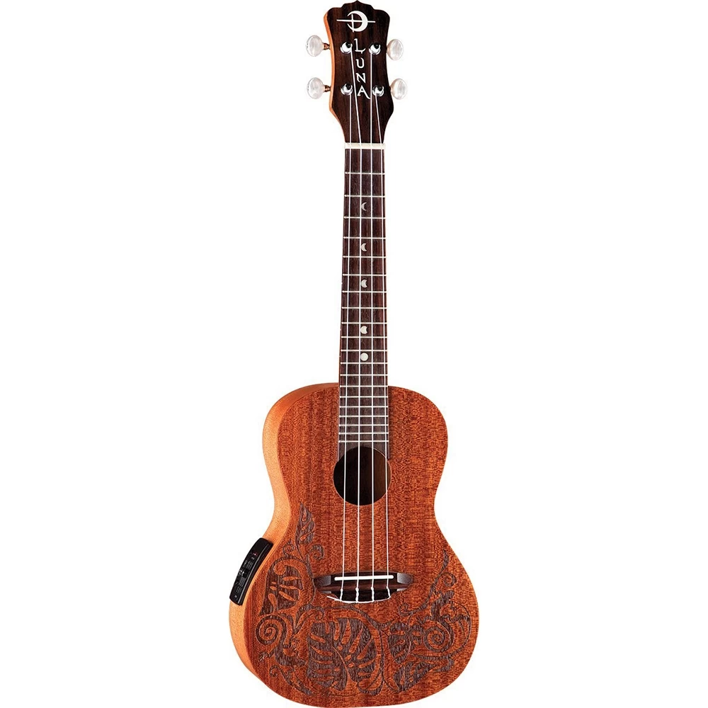 To the early Hawaiians the mo’o (lizards) were a symbol of spirituality and good fortune. Shape-shifting and agile, lizards are one of the oldest and most powerful of Polynesian guardian spirits.These graceful lizards intertwine amongst tropical Monstera leaves on this fanciful uke and are sure to bring good mojo to your playing.