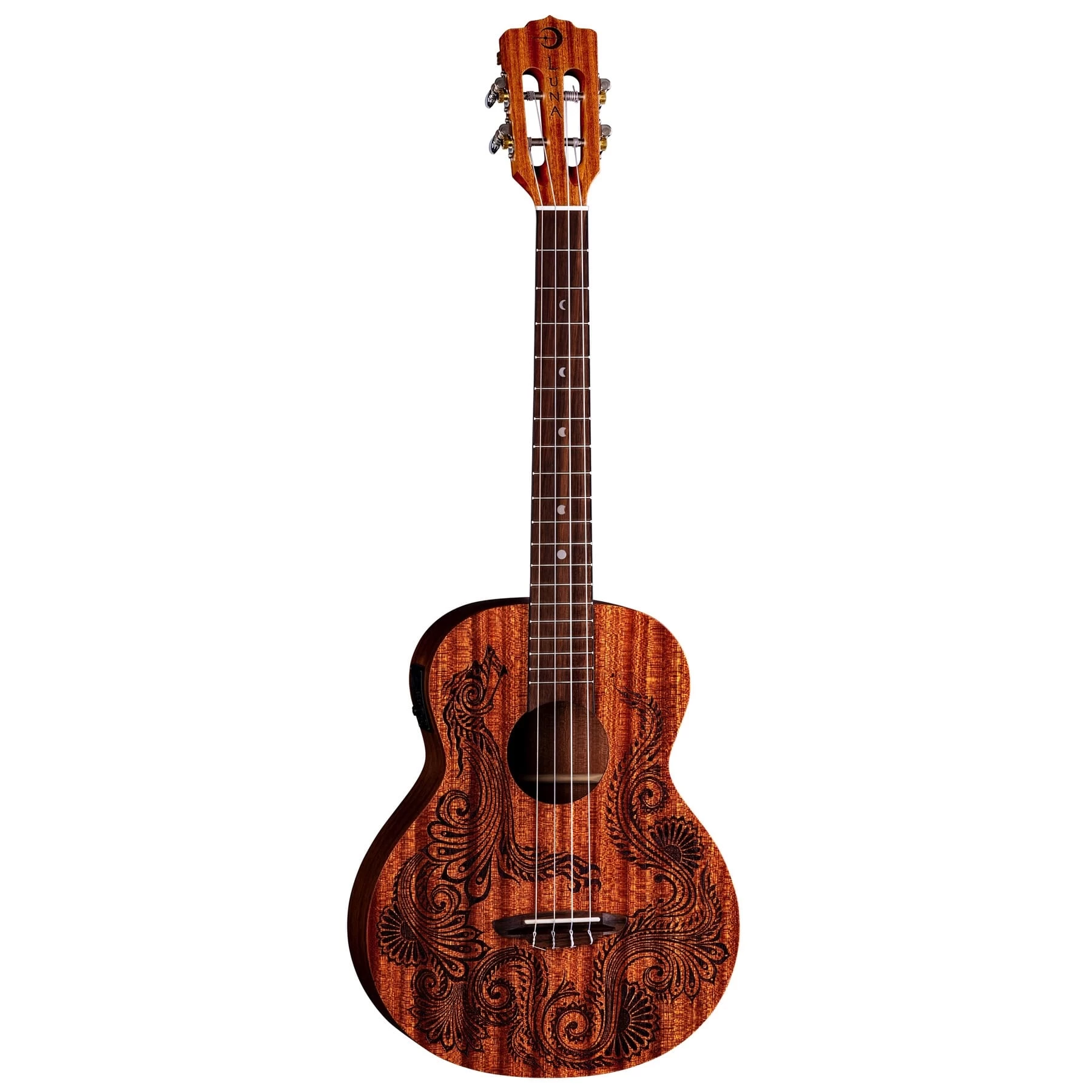 Let the strength of the Dragon lift your spirits to try anything new. Historically, the symbol of the fearless Dragon is deeply rooted in many cultures across the world for its spiritual meaning of offering courage to those who need strength the most. Much like its acoustic guitar counterpart, the Henna Dragon Mahogany Baritone uke is a powerful ally to have by your side along your musical journey, whether you are learning how to play or in it for the long road. Built on a larger baritone body shape, expect an abundance of deep warm tone coming from the all-mahogany body. Enjoy fluent articulation with Aquila strings and an elegant slotted headstock. Feel a level of confidence amplifying your sound on the big stage with the Luna preamp and built-in tuner. The power is at your fingertips and the dragon is there to guide you every step of the way! Gigbag included. Join the Luna Tribe! Designed by UK Henna Artist, Alex Morgan.
