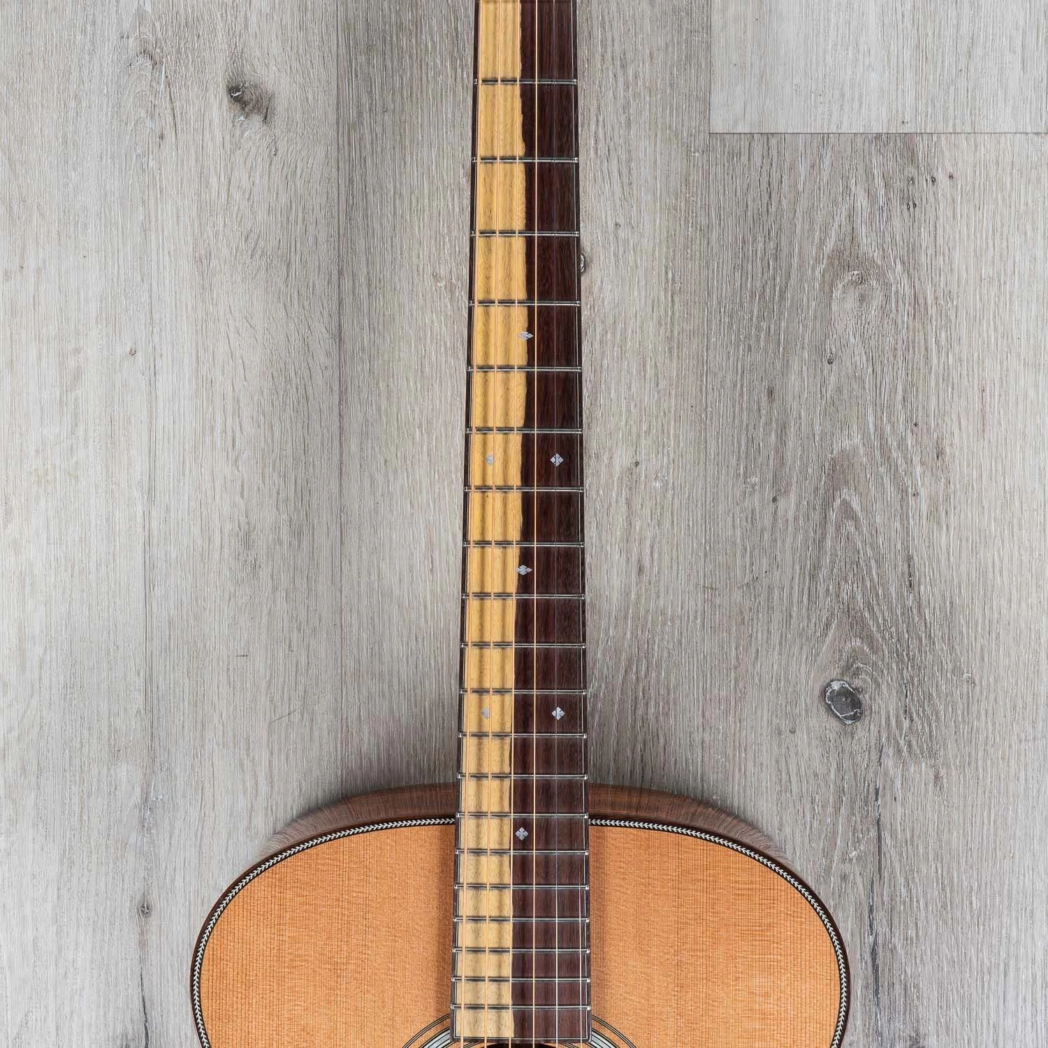 The unique tonewoods used here are bright and snappy while still being full and loud. The katalox fretboard and figured padauk back and sides are nicely complemented by the western red cedar top. The katalox has a similar tone to ebony and padauk is similar to maple with maybe a bit more warmth to it, overall. It’s a guitar that can handle hard strumming but is also dynamic enough for fingerstyle playing. It leans toward the brighter side of the tonal spectrum without being shrill or piercing. It’ll sound great played solo and will also cut through nicely in a band setting.