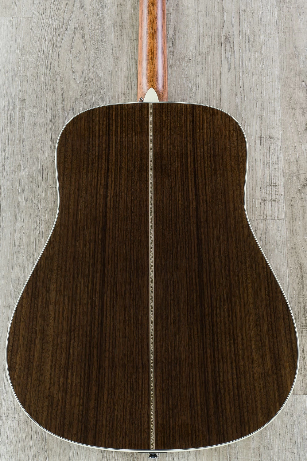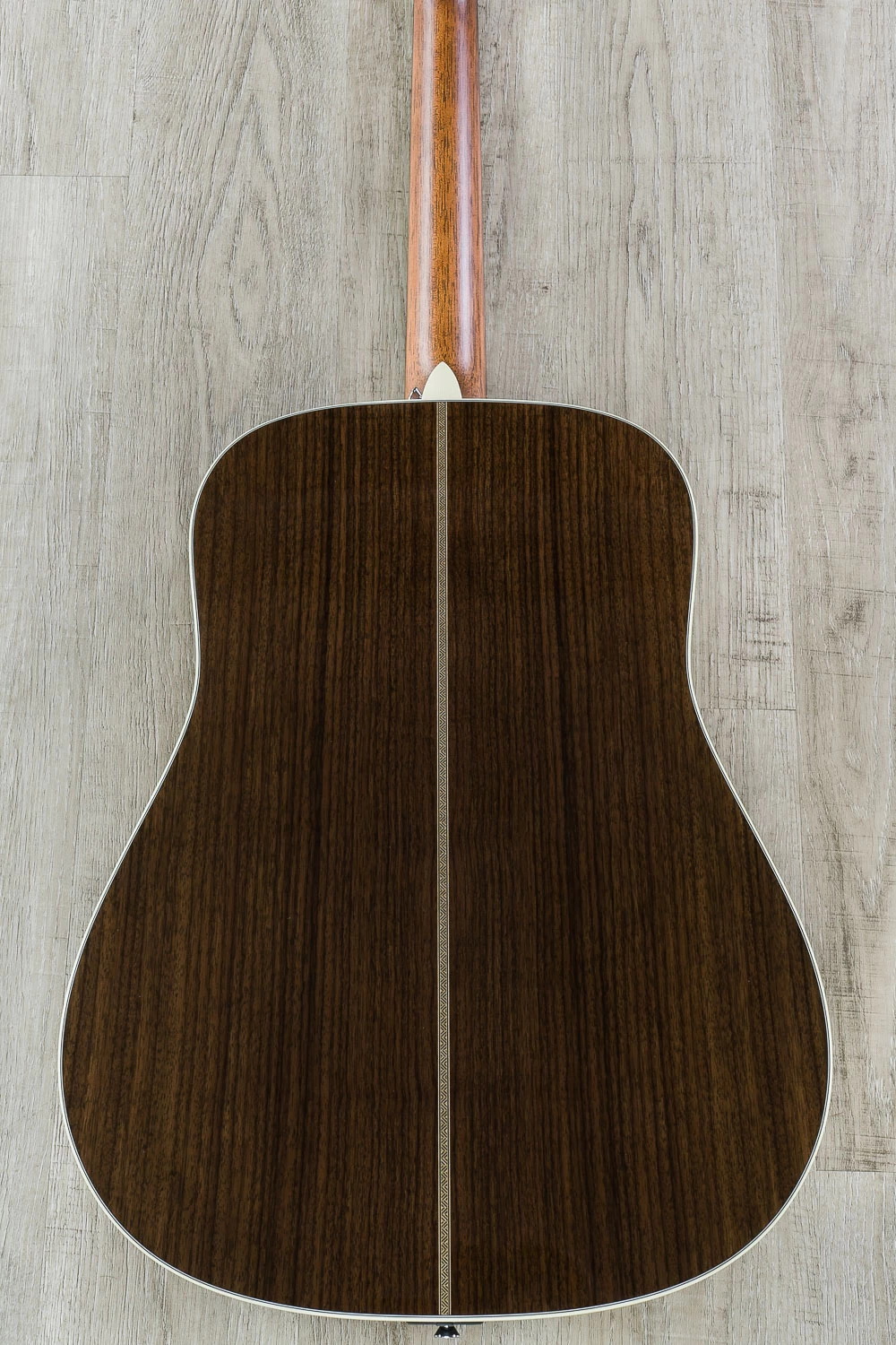 This guitar is a modern installment of the famously rich-toned HD-28. A true re-creation of a classic, this guitar’s homage to the past is novel rather than nostalgic. It has that classic old-school dreadnought response that can’t be faked. There’s a rich woody snap to the sound in all registers, and the low-end is especially delicious. In fact, this is one of the models that made dreadnoughts notorious for their incredible bass response. Strum a big open position chord, and you can feel the sound in your gut in a way that usually only happens with some type of amplification. The neck is hefty but quite comfortable. Breakneck bluegrass, down home blues, open position folk strumming, country – the best players from all walks of life have used this guitar because it creates music and leaves the rest up to you.