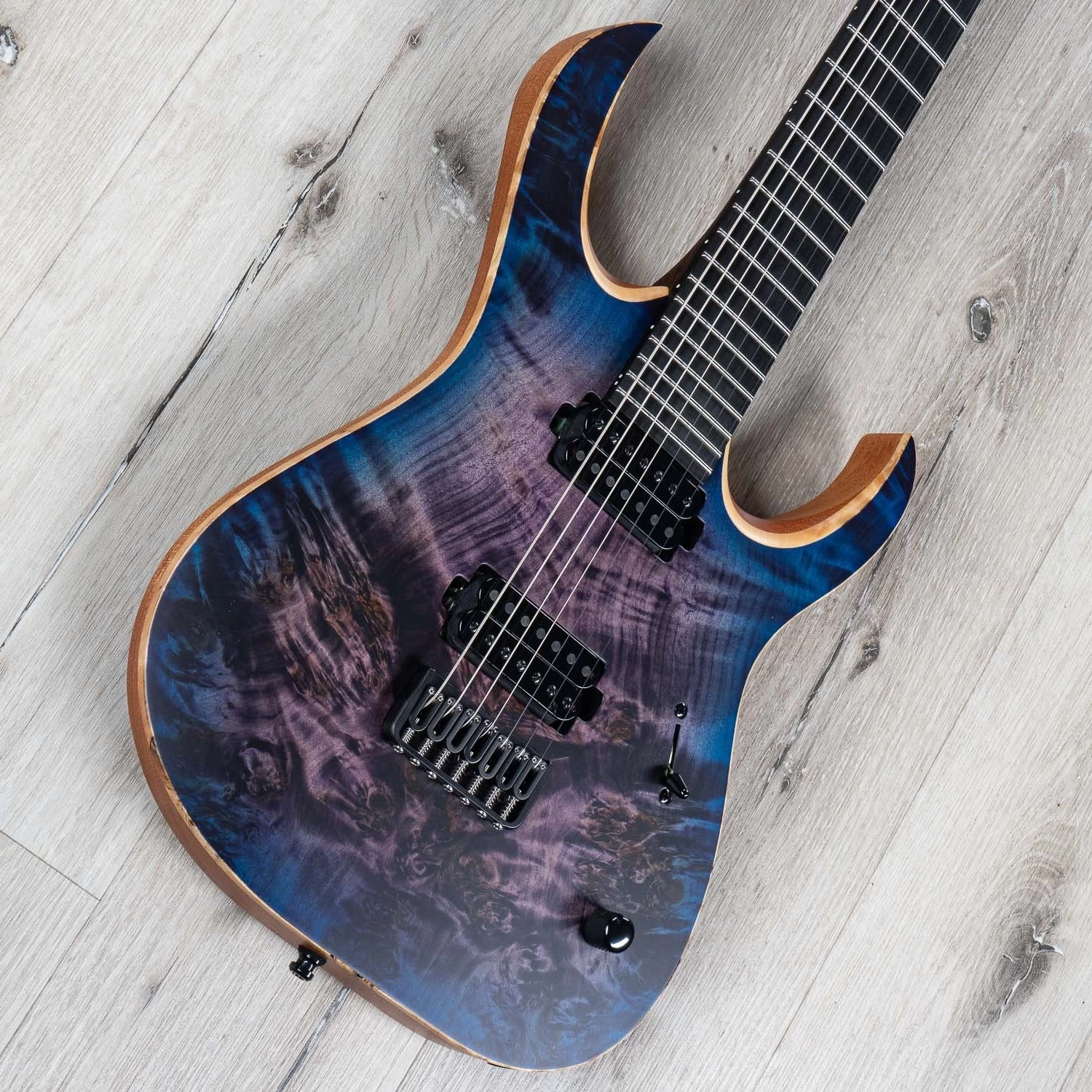 Music Store Live is proud to be an official Mayones dealer. If you haven’t checked these guys out yet, you’re in for a real treat! This one sports a stunningly beautiful eye poplar top and a dark and luscious purple to blue burst finish.