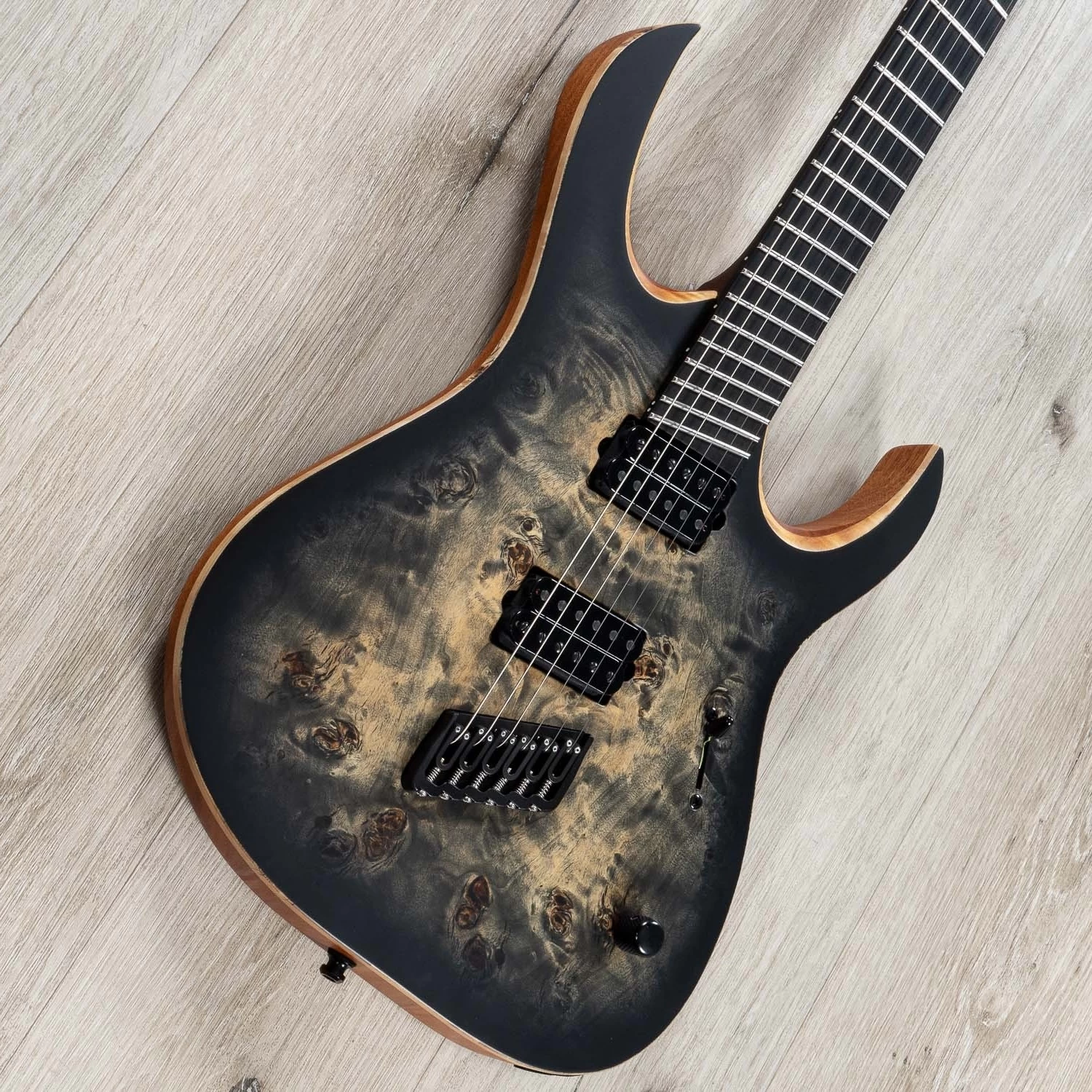 We’re proud to present this gorgeous Duvell Elite VF 6 multiscale axe from our friends over at Mayones! This one’s in an absolutely beautiful Trans Jeans Black Burst Satine finish.