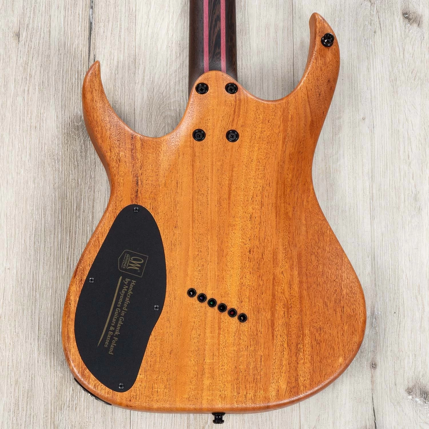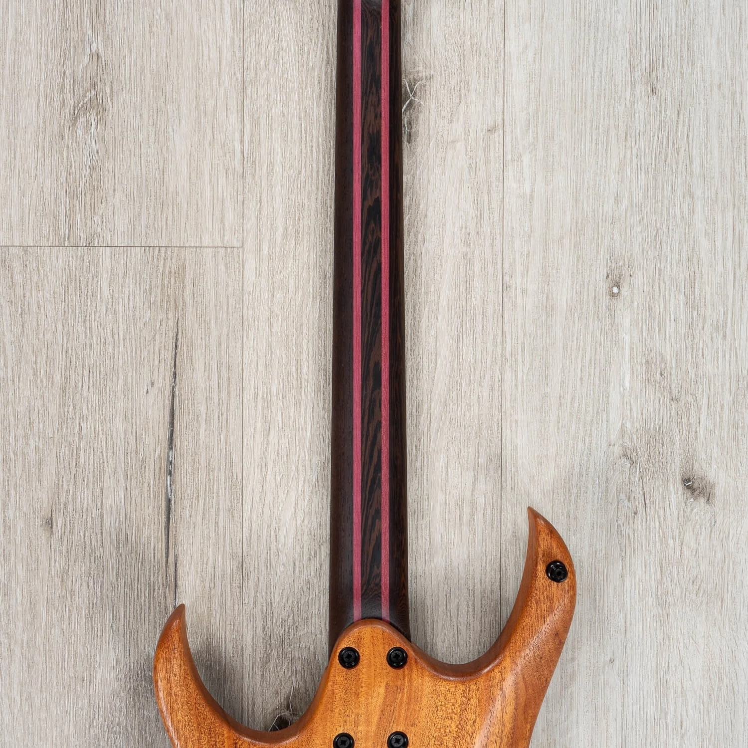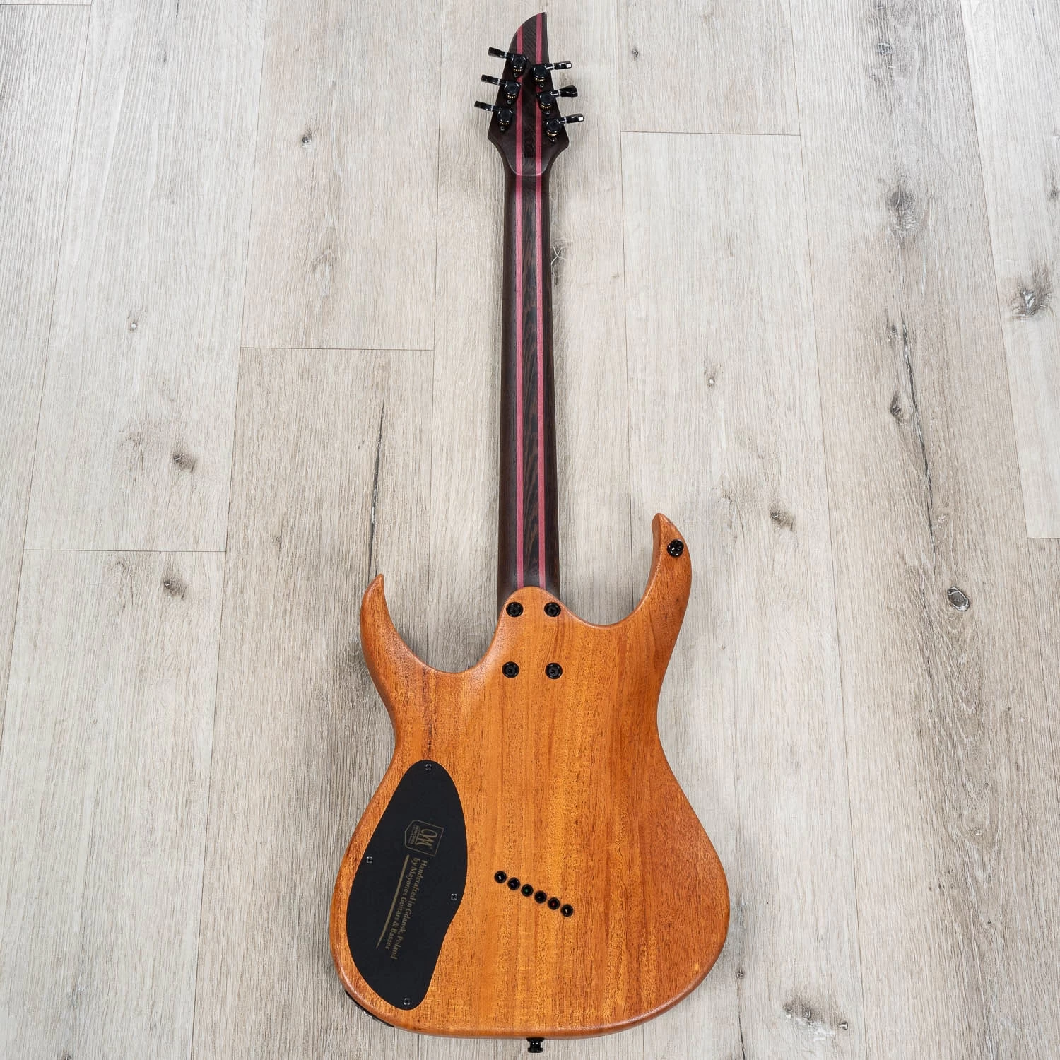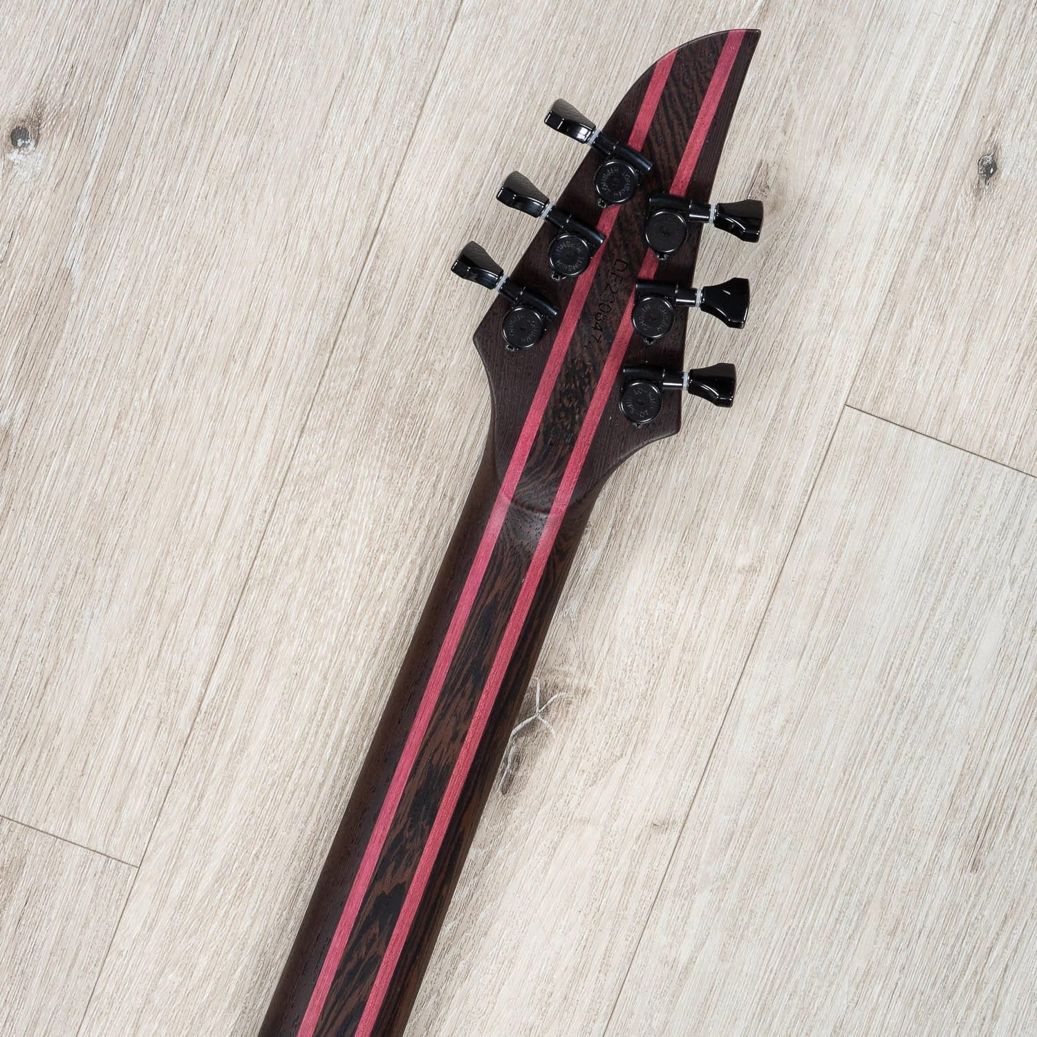 The modern 16″ radius ebony fretboard and earthy-feeling Wenge neck plays lighting-fast up and down the neck and feels incredible in the hand, as with every Mayones instrument we have in. Transitioning to a multi-scale format will feel effortless on this neck. The bare wood-feeling Wenge/Purpleheart neck back in particular is a truly unique playing experience, as your hands seemingly glide over it, in addition to looking awesome. The combination of Hipshot locking tuners and hardtail bridge offers supreme tuning stability, while the custom-wound, Mayones-exclusive Bare Knuckle TKO pickup set, while designed for high-gain chug, surprised the players here at the shop with their awesome clarity on clean settings, especially with the coil-split on the volume control. Of course, the TKOs excelled the most at distorted riffage, and we were very pleased with how both single notes and chords sounded huge without getting muddy.