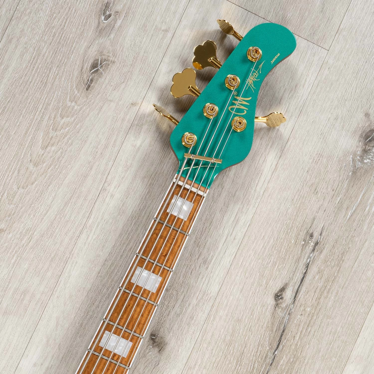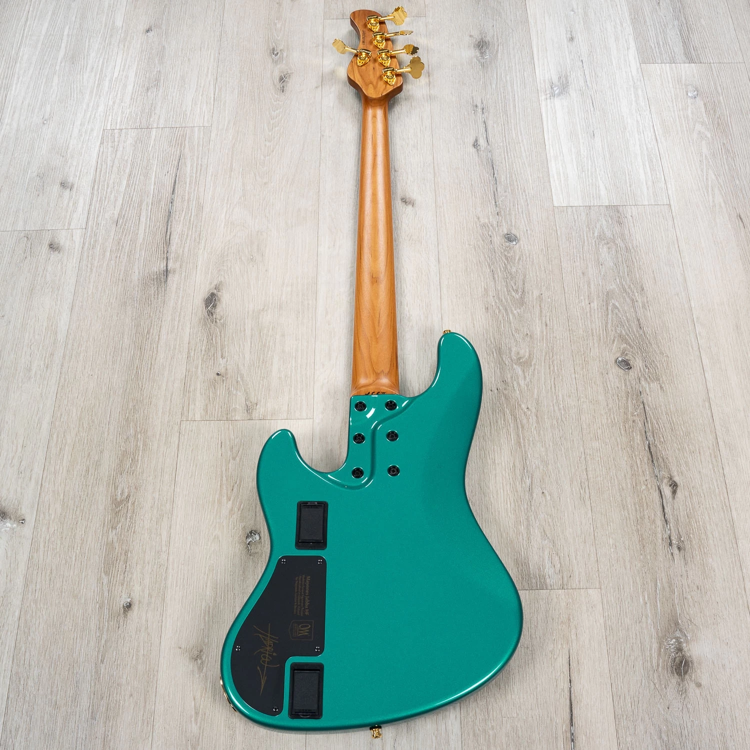 Although they’re known for instruments with a more modern aesthetic, Mayones crafted this Hadrien Feraud signature 5-string bass in a way that combines vintage looks with contemporary tone and versatility. Upon opening the premium Mayones hybrid bag, we were immediately greeted by the gorgeous combination of the beautiful classic color Sherwood Green Metallic and striking gold hardware on this beautiful instrument.