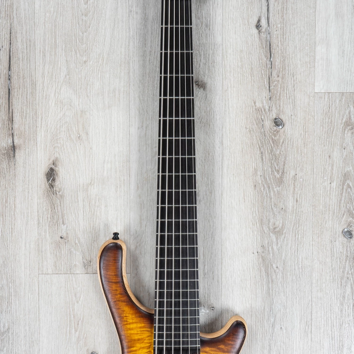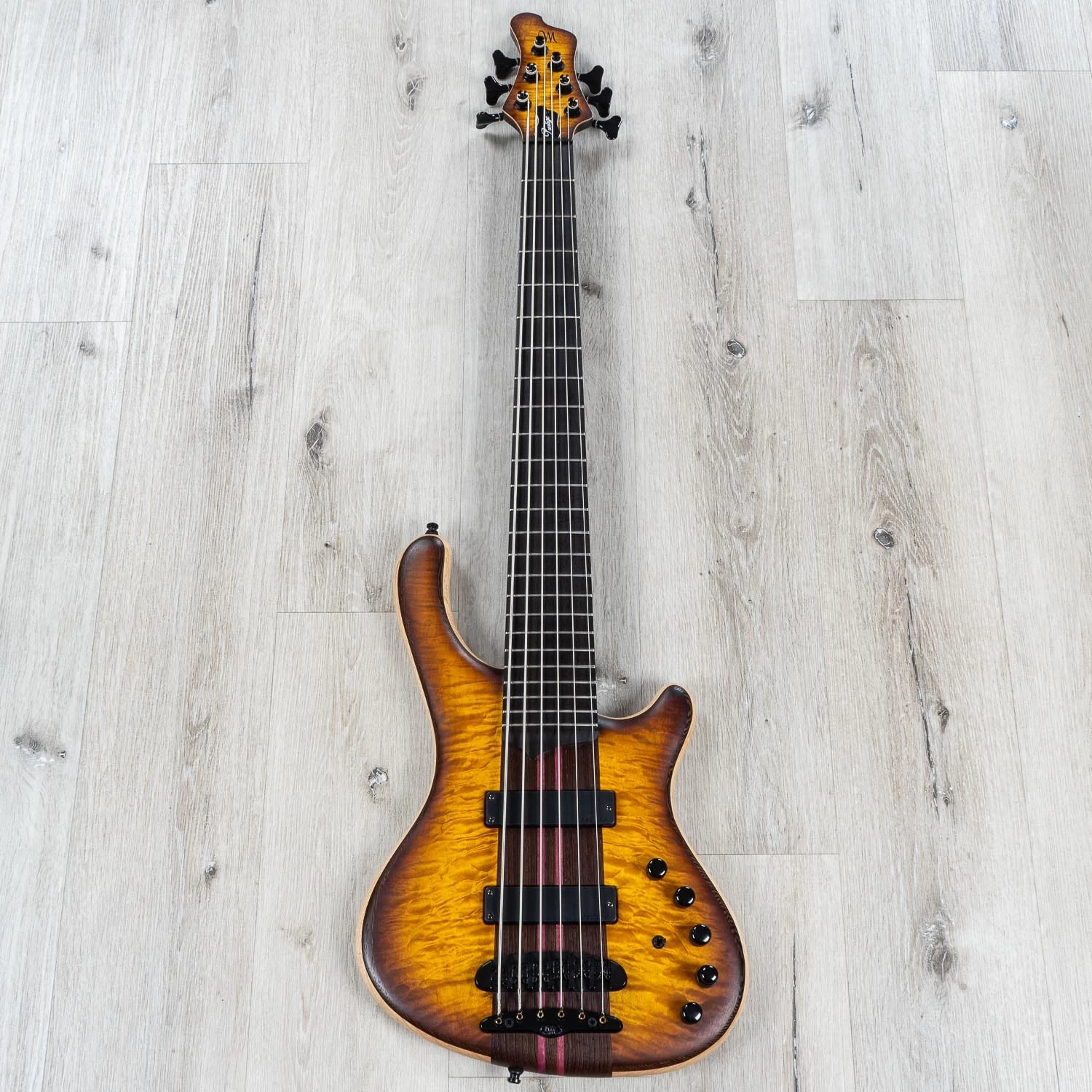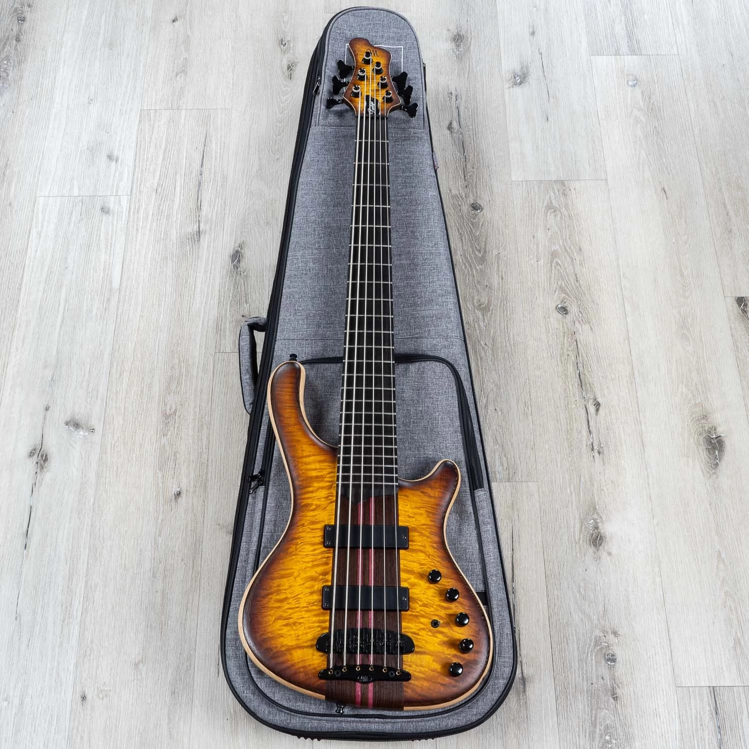 This is a bass player’s dream. The fretwork is impeccable, the neck is slim from front to back but doesn’t feel like a toothpick. It’s comfortable even if you are new to the 6-string world. The 34.25″ scale and excellent build quality keeps the B-string tight, but by not making this a 35″ scale length you also don’t sacrifice the tone of the G and C-strings. Sometimes C-strings on extended scale basses can sound a bit nasally and whiny. Like a dying cat (Gary Willis said that and we’d had to agree in some instances). But not with this Mayo! The C-string is still nice and full and harmonically rich while the B-string is tight and punchy. All the strings in between feel pretty great too! 🙂