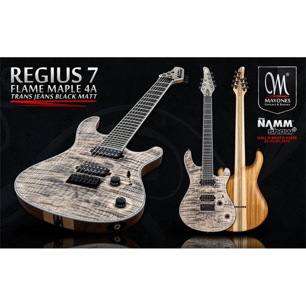 The mighty Regius 7 with additional B string for a massive low-end. Neck-thru-body construction, Swamp Ash body and ‘curly’ Redwood top, Ebony fingerboard (24 frets, no markers). Standard 25,4″ scale. Fixed bridge, Seymour Duncan pickup set.