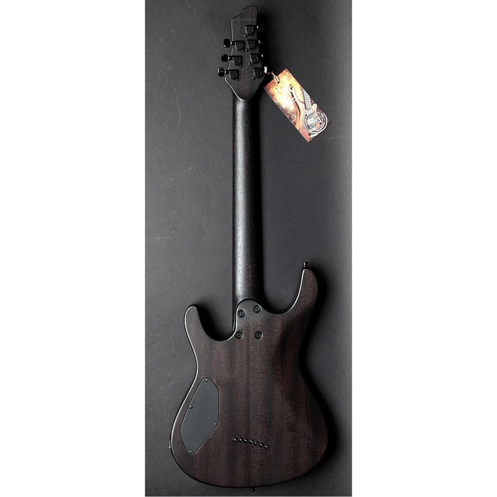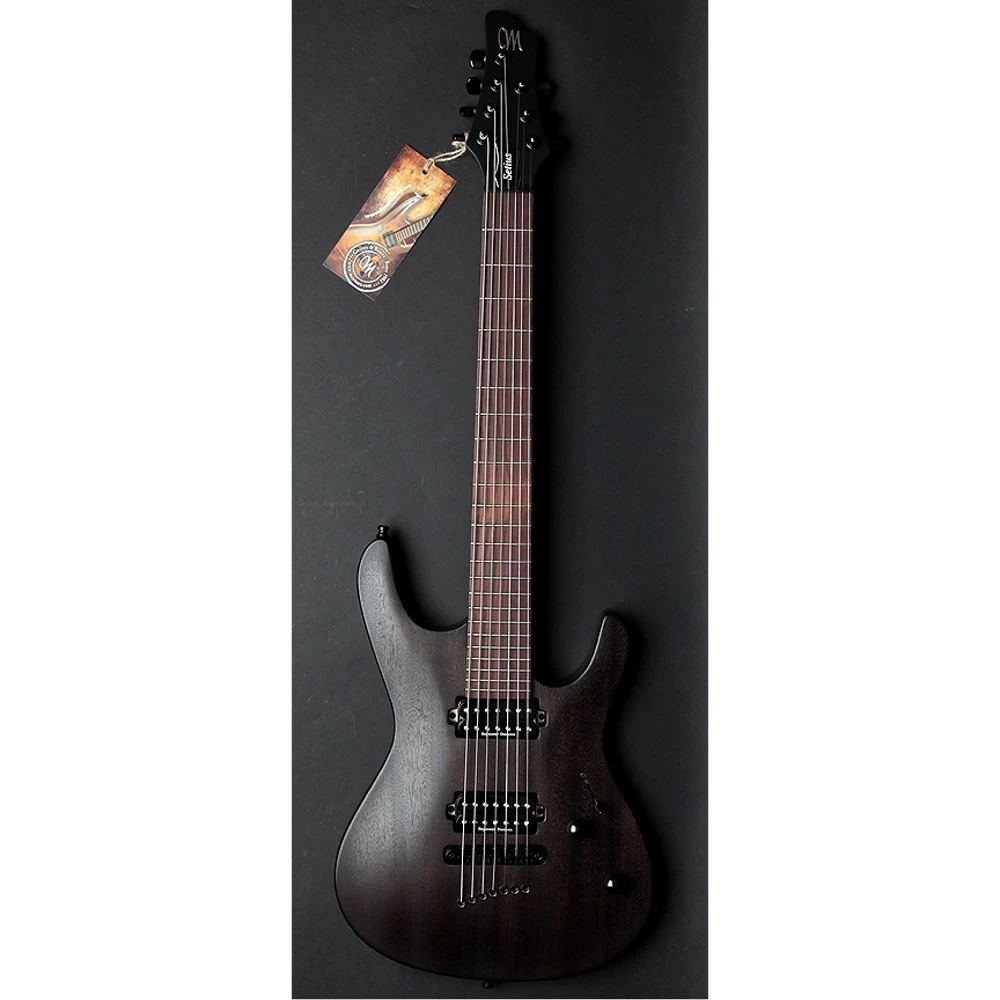 7-stringed Setius with fixed bridge ‘double cutaway’ Solid Mahogany body in transparent black matte finish. Bolt-on construction, 5 pcs Mahogany-Maple neck, plain Rosewood fingerboard and 25.4″ scale. Comes with Seymour Duncan SH27+SH47 pickups, Schaller tuners and tune-o-matic, strings-thru-body bridge for optimal sustain. Includes Mayones Deluxe Gigbag