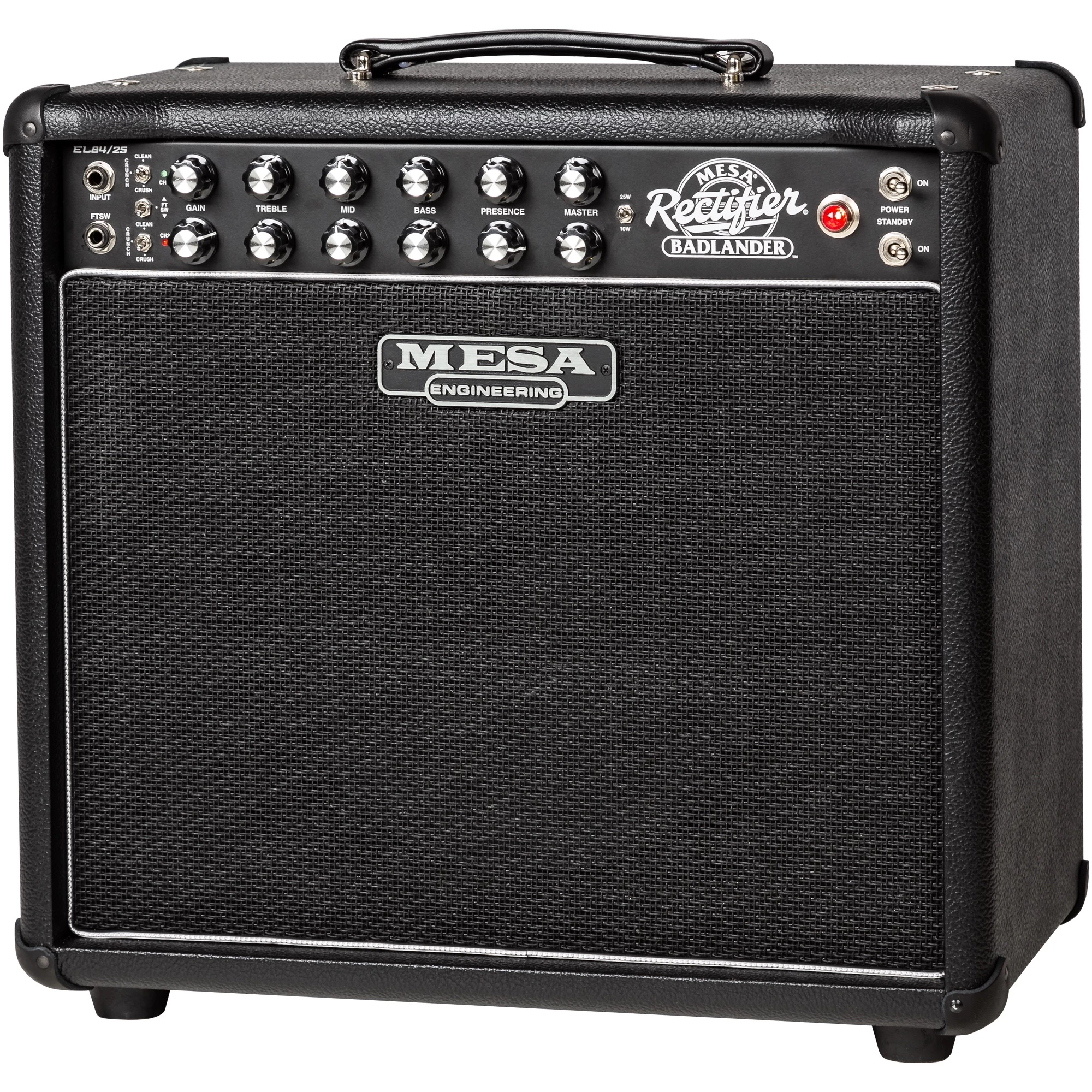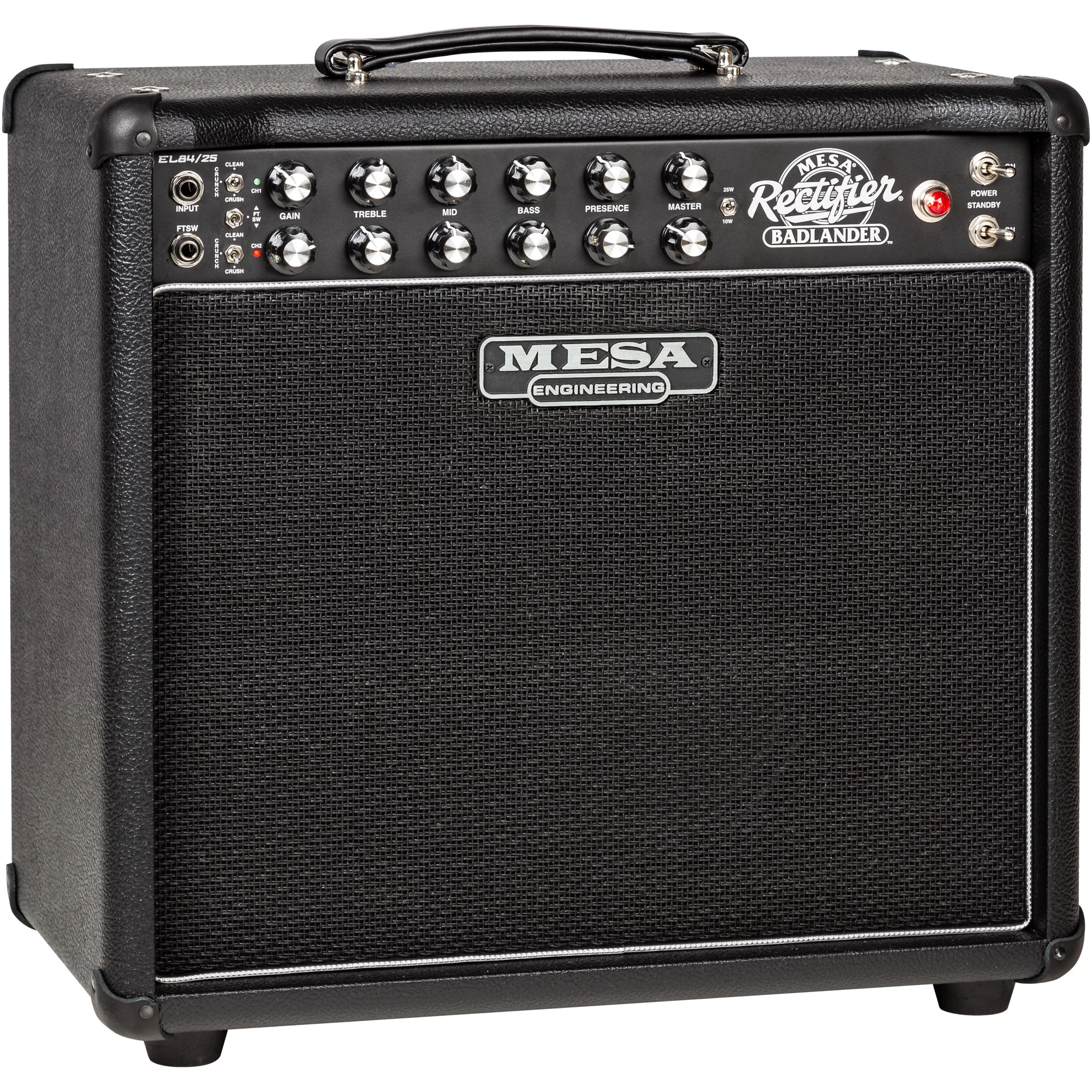 The Badlander 25 1×12 Combo delivers the Rectifier-inspired voice and performance of the Badlander 100 and 50, offering a fiery-sounding, ultra-portable low-power option for those not needing big horsepower. The same simple 2 channel format, each containing Clean, Crunch, and Crush modes repeated, fits perfectly within this small EL84powered rendering with a fierceness and harmonic complexity all its own.