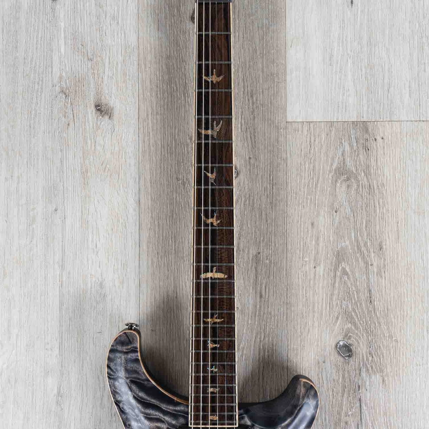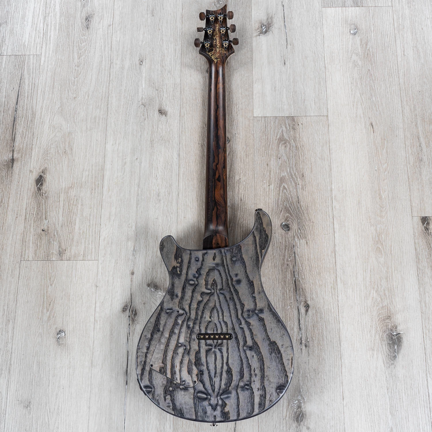 We scoured through PRS’s private stock wood room to find the pieces used for this guitar. Notice the heart shape on the top just under the bridge. And the gorgeous ash back is a one-of-a-kind piece, for sure. We went with an awesomely figured piece of ziricote for the neck, but we chose a more tame piece of ziricote for the fretboard so that the spalted maple bird inlays would stand out. The ziricote neck feels absolutely incredible. We love the way raw wood necks feel. Over time they just get better and better as the natural oils from your hands seep into the pores of the wood. In our experience, these are the types of necks that start off feeling amazing and only continue to improve over time. The tone is very similar to Brazilian rosewood, which is usually regarded as the holy grail of tonewoods. It’s smooth, full, and warm, while also having a very defined and bell-like top-end that shines through beautifully.