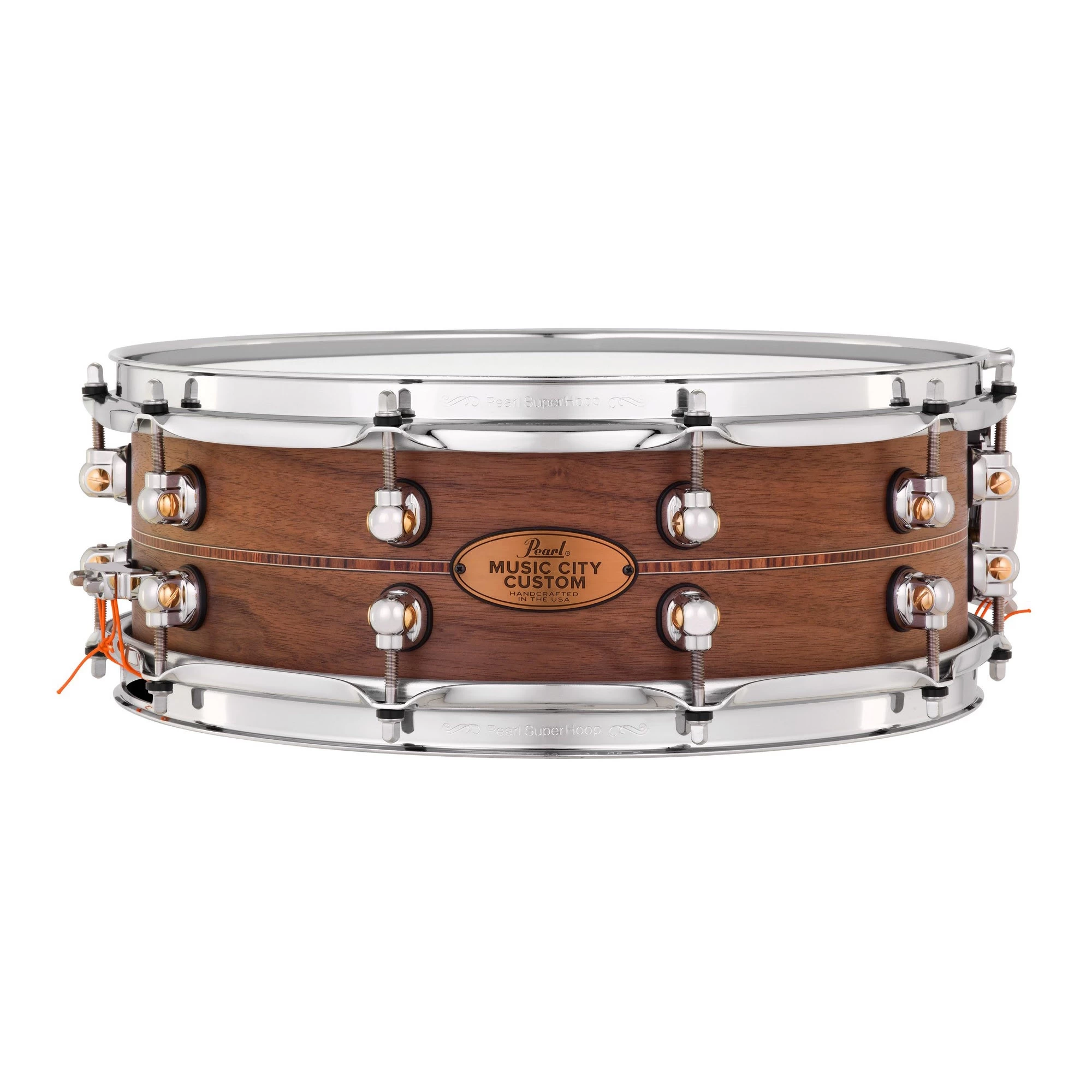This unique Music City Custom Solid Shell Snare Drum features a single center inlay of Brazilian Kingwood, our elegant single STL swivel lugs, Stainless Steel tuning rods, and SuperHoop II triple-flanged hoops. Honed by a singular artisan with time-honored precision, Pearl’s Music City Custom Solid Shell Snare Drums are uniquely refined, American-made percussion instruments. Beginning with a steam-treated plank of premium North American Walnut, each Music City Custom solid shell is shaped using an old-world crafting technique derived from ship-building. Hand-milled to a smooth, uniform 8mm thickness and combined with Solid Maple reinforcement rings, each shell is CNC drilled, hand-finished, and assembled at Pearl’s Music City Custom Shop in Nashville, TN. The distinctive tonal nature of this one-of-a kind percussion instrument make it a true an investment in the ultimate drumming voice.