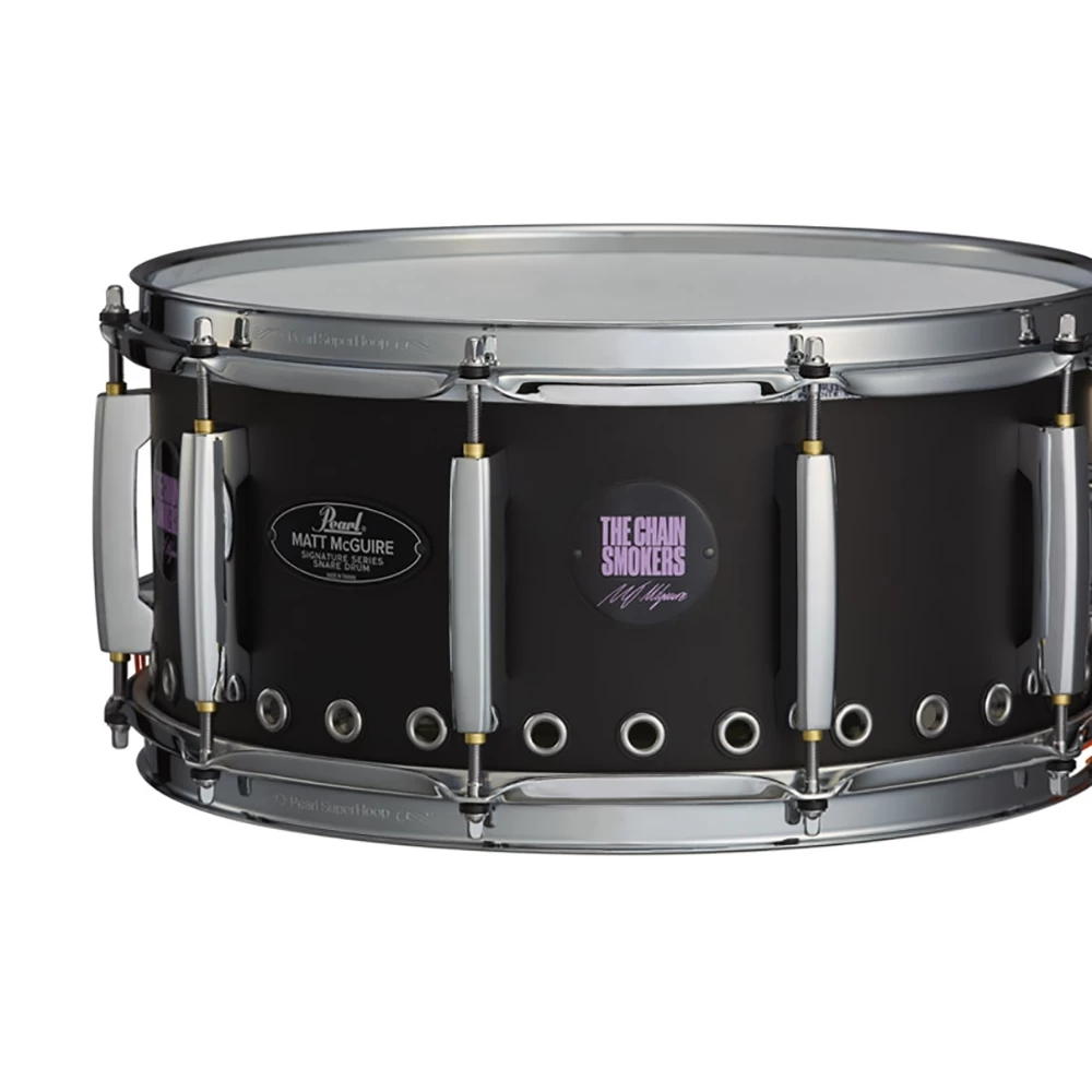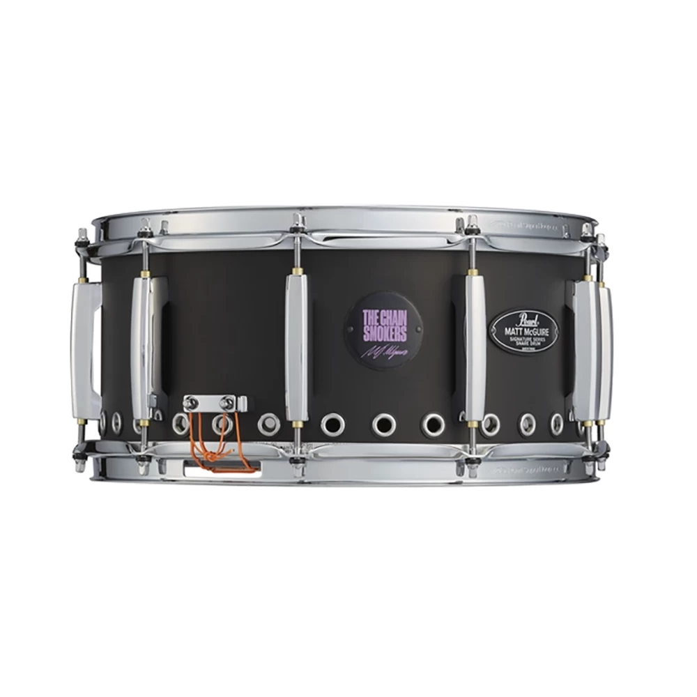 Matt McGuire’s Pearl Signature Snare Drum features a 1mm Rolled Steel shell with 30 reinforced 1/3″” vents around the bottom edge. This unique design enhances snare response and delivers unique tonal bite. Its powder coated Matte Black finish further tempers its uniquely bright tone, and Pearl’s reliably durable SuperHoop II 2.3mm Hoops and CL Bridge Lugs add weight for increased projection. This Tour Edition of Matt’s snare not only includes two additional badges featuring The Chainsmokers logo and Matt’s Signature, it is also imbedded with NFC Chip technology. A simple tap with any Smartphone instantly unlocks exclusive content created by Matt himself.