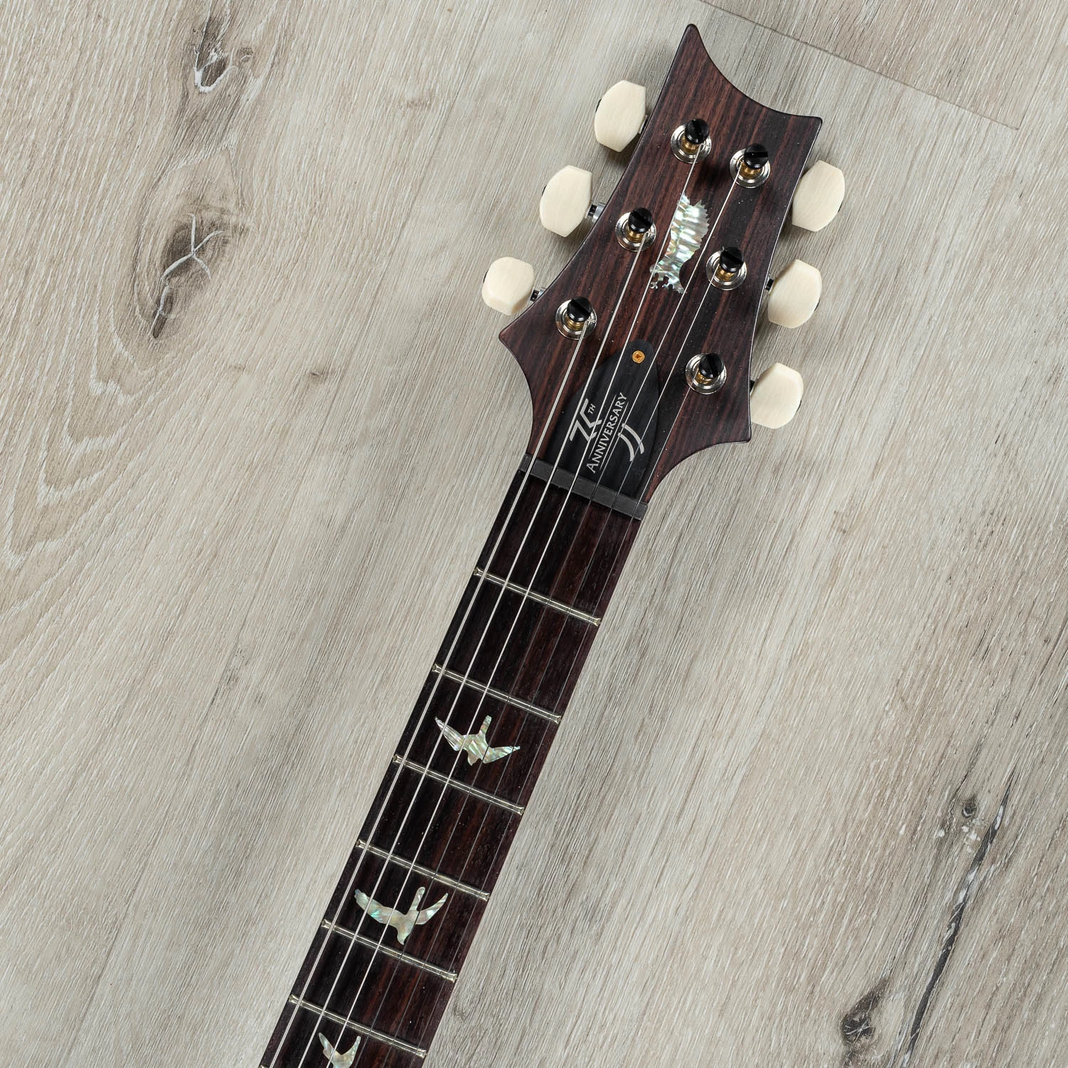 Built on the foundation of the Custom 24, this 35th Anniversary version has a few features from the 24-08 and a few from the Paul’s Guitar as well. The mini-toggles allow you to split each pick up so you can achieve combinations of single-coil and humbucking sounds. The pickups have been completely redesigned and revoiced and they sound awesome! They have the perfect amount of edge and bite to them so they can handle higher gain settings, but they also clean up beautifully and have that chimey and wonderfully musical and vocal-like quality that the PRS pickups are known for. They pack a good punch and will hit your pedals and your amp with some oomph, for sure. The nitro finish is also a great addition that will help this guitar only sound better and better over time the more you play it. It will allow the wood to breathe in a way that really does add some life to the notes.