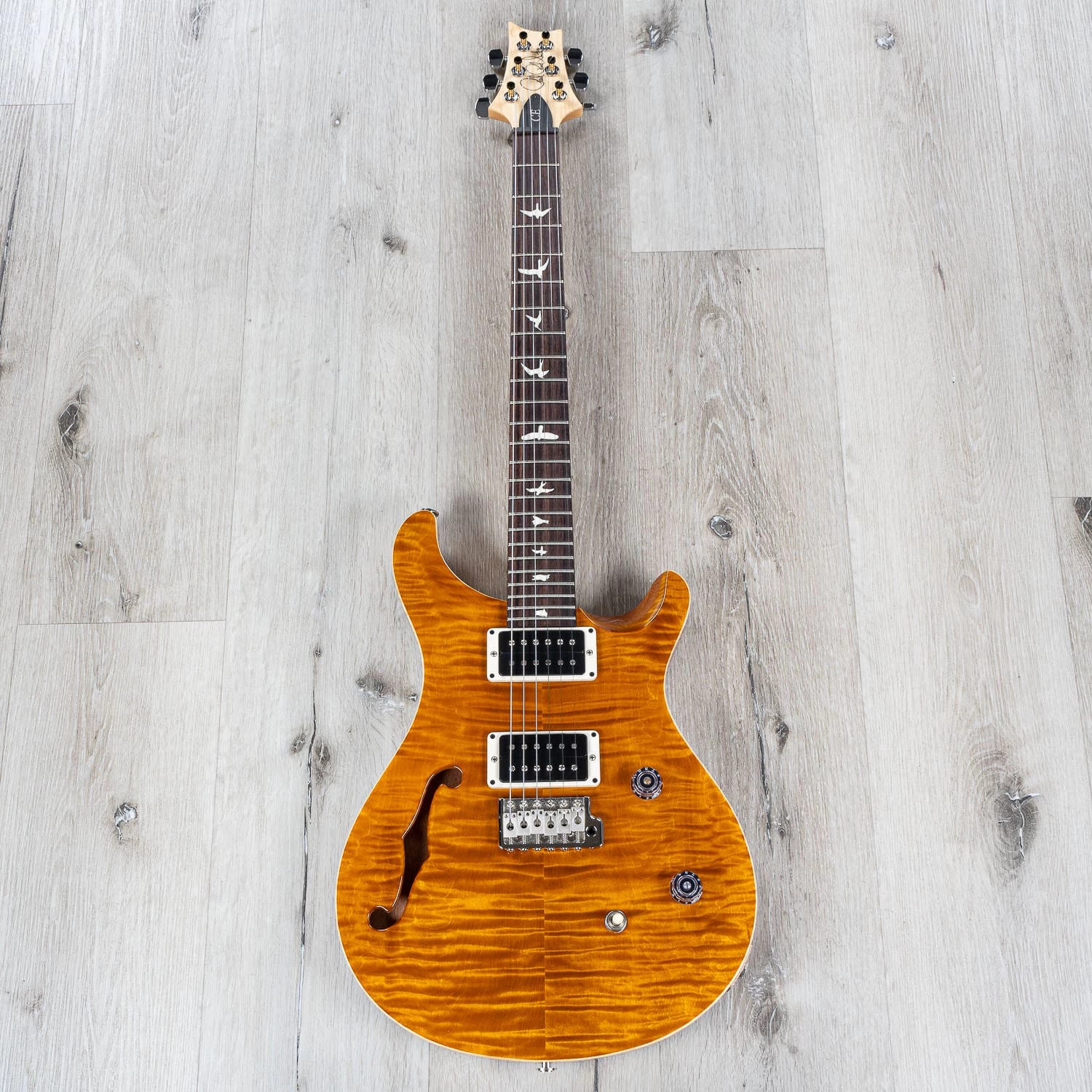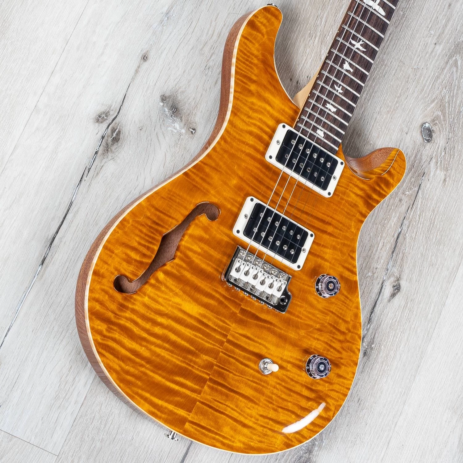 Combining the snap and sustain of a bolt-on guitar with the airy resonance of a semi-hollow body, the CE 24 Semi-Hollow is a truly unique addition to the PRS Bolt-On lineup. The body pairs the traditional combination of a mahogany back and maple top with a bolt-on maple neck and rosewood fretboard. The neck features a Pattern Thin carve and satin nitro finish for a natural, addictive feel. The electronics consist of a volume and push/pull tone control with a 3-way toggle switch, giving a total of six classic sounds from the PRS 85/15 pickups.