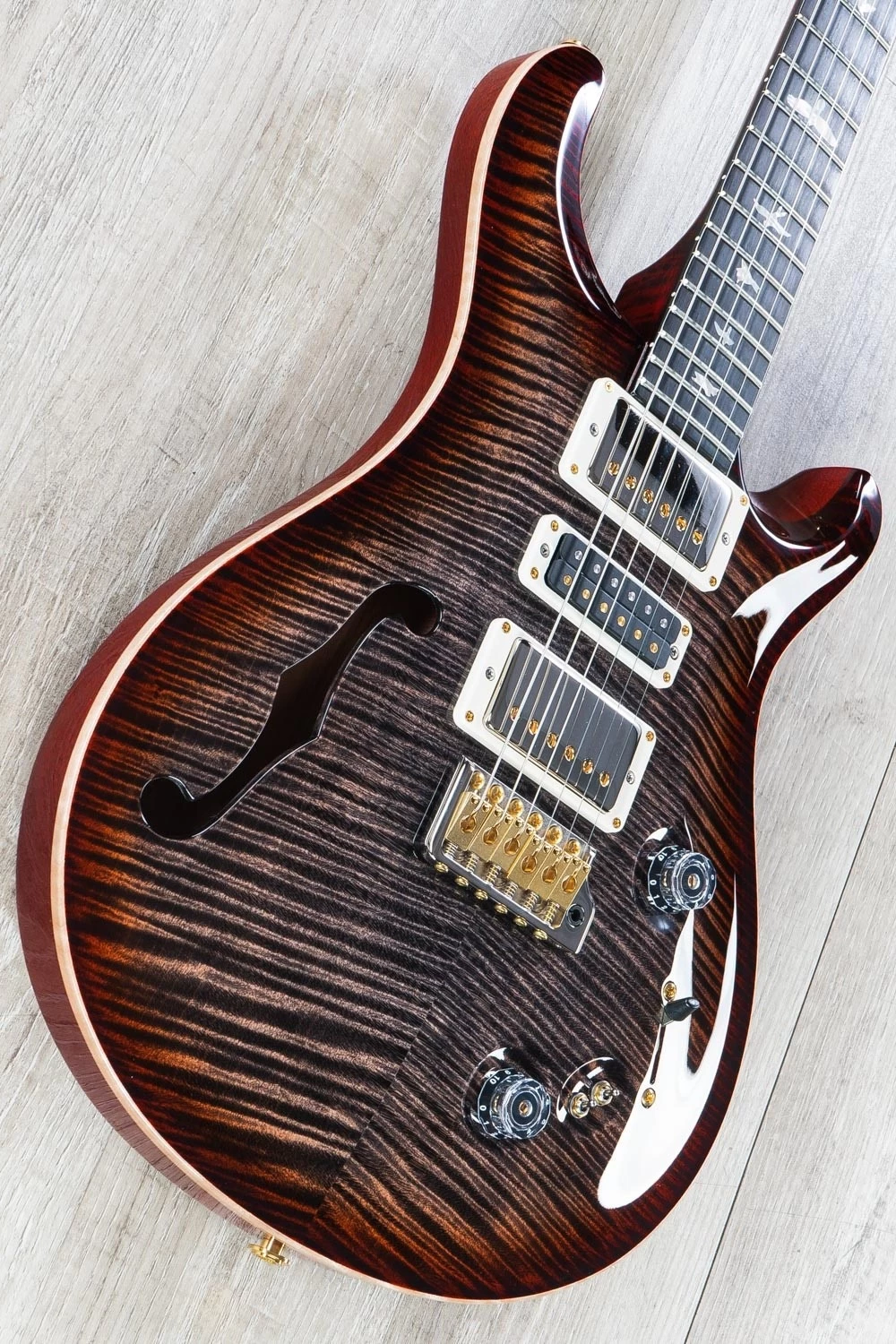 The subtle differences in tonewoods for this wood library run of Special 22’s will add to the overall brightness of the sound. The high mids and treble frequencies are enhanced with the combination of the neck woods. African Blackwood sounds remarkably similar to Brazilian Rosewood with that top end shimmer and sparkle to it that other rosewoods (and even ebony) miss out on. It has a warmth to it while still being very bright and snappy. Of course, the flame maple neck will also add some more brightness to the tone compared to a mahogany neck, for example. It all pairs together wonderfully for a sound that is crisp, defined, and extremely articulate. You end up with all of that semi-hollow goodness without ever running the risk of sounding muddy.