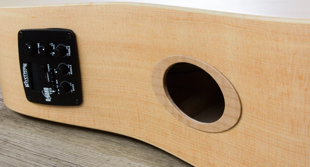 Now, I’m sure, if you’re anything like me, you’re going “that’s great and all… but how does the guitar sound? How does it play?” Well, this thing absolutely kicks ass! The neck plays like an electric guitar’s neck. It’s thin, narrow, and super fast to play. Made in Canada with all locally-sourced woods, the Riversong guitars are not all gimmicks and flashy technology. They sound awesome and they play extremely well! The tone is very balanced with focused and tight bass response and treble that cuts through without being shrill or piercing. The sound diffuser in the main soundhole helps with a lot more than just preventing feedback. It actually balances out the tone for a sound that continues to be full of energy throughout the entire sustain of the notes. Another convenient soundhole is located in just the right spot and angled to just the right degree that you end up with a monitor through which to hear yourself without any compromise whatsoever to the quality of the tone or integrity of the guitar.